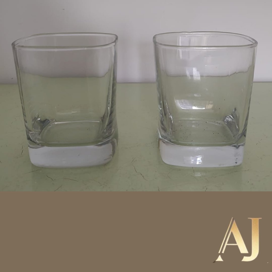 12 copos de whisky de vidro por R$ 5,00 a unidade.