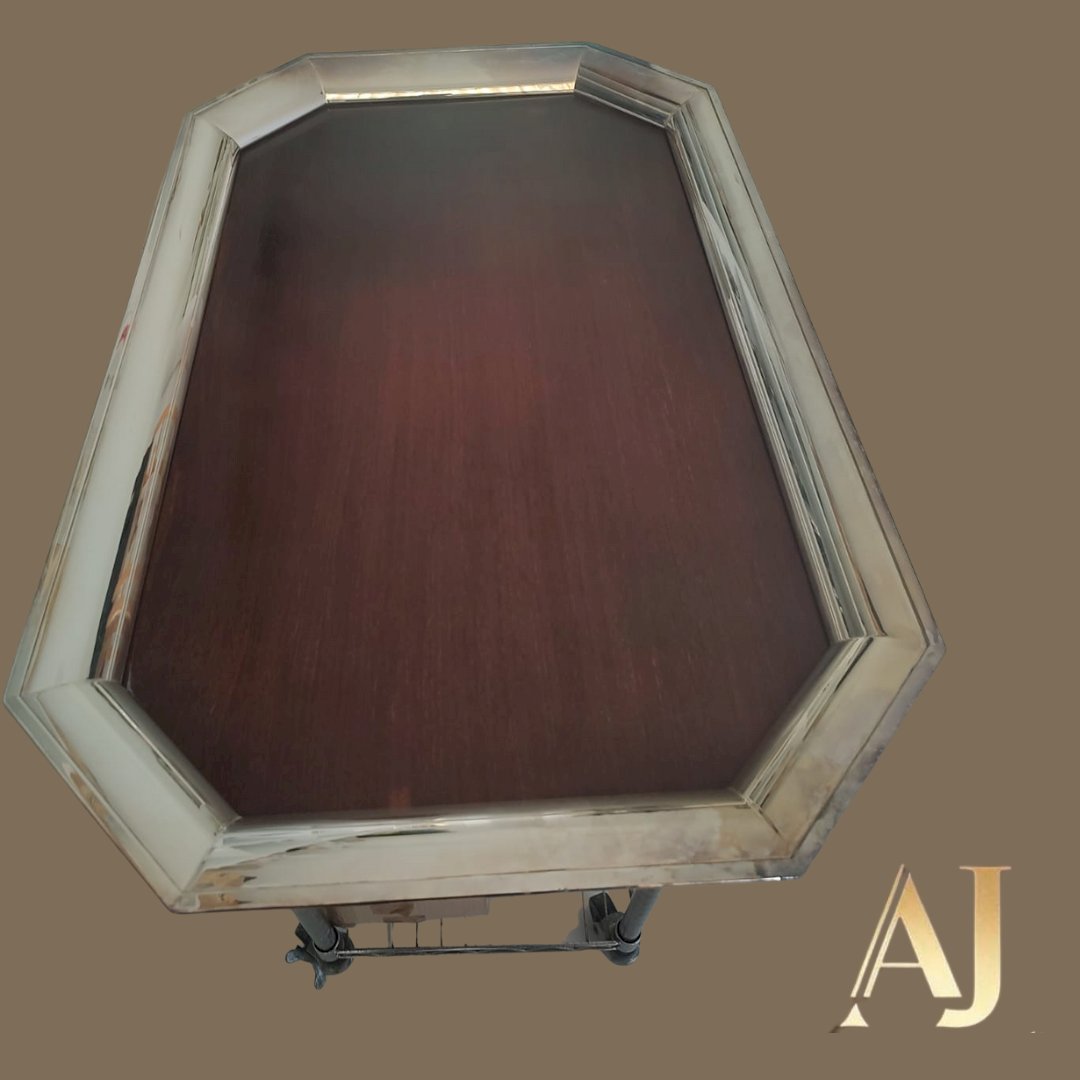Bandeja com fundo de madeira e lateral  com banho de prata