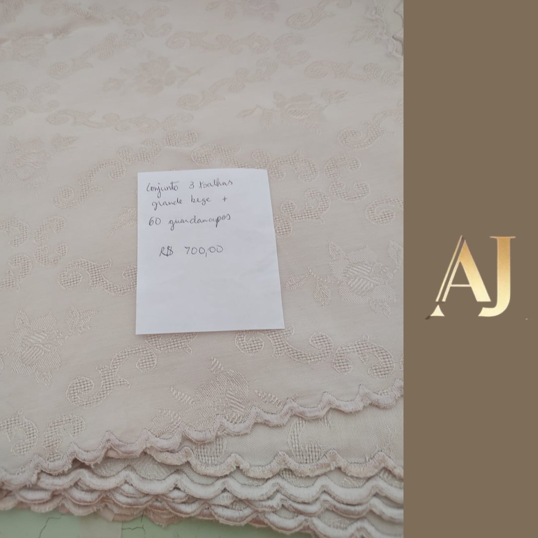 Comjunto de 3 toalhas de mesa beges grandes e 60 guardanapos 700,00