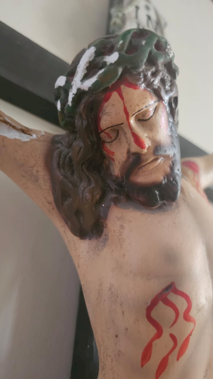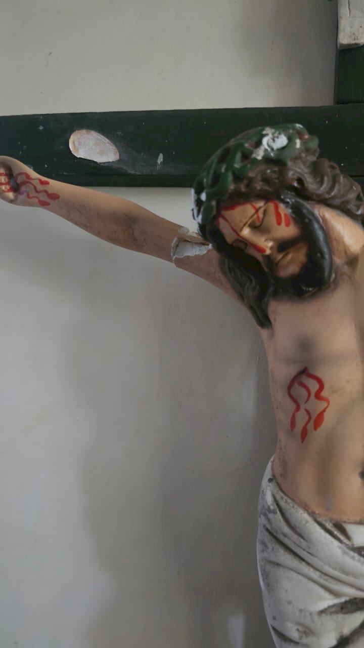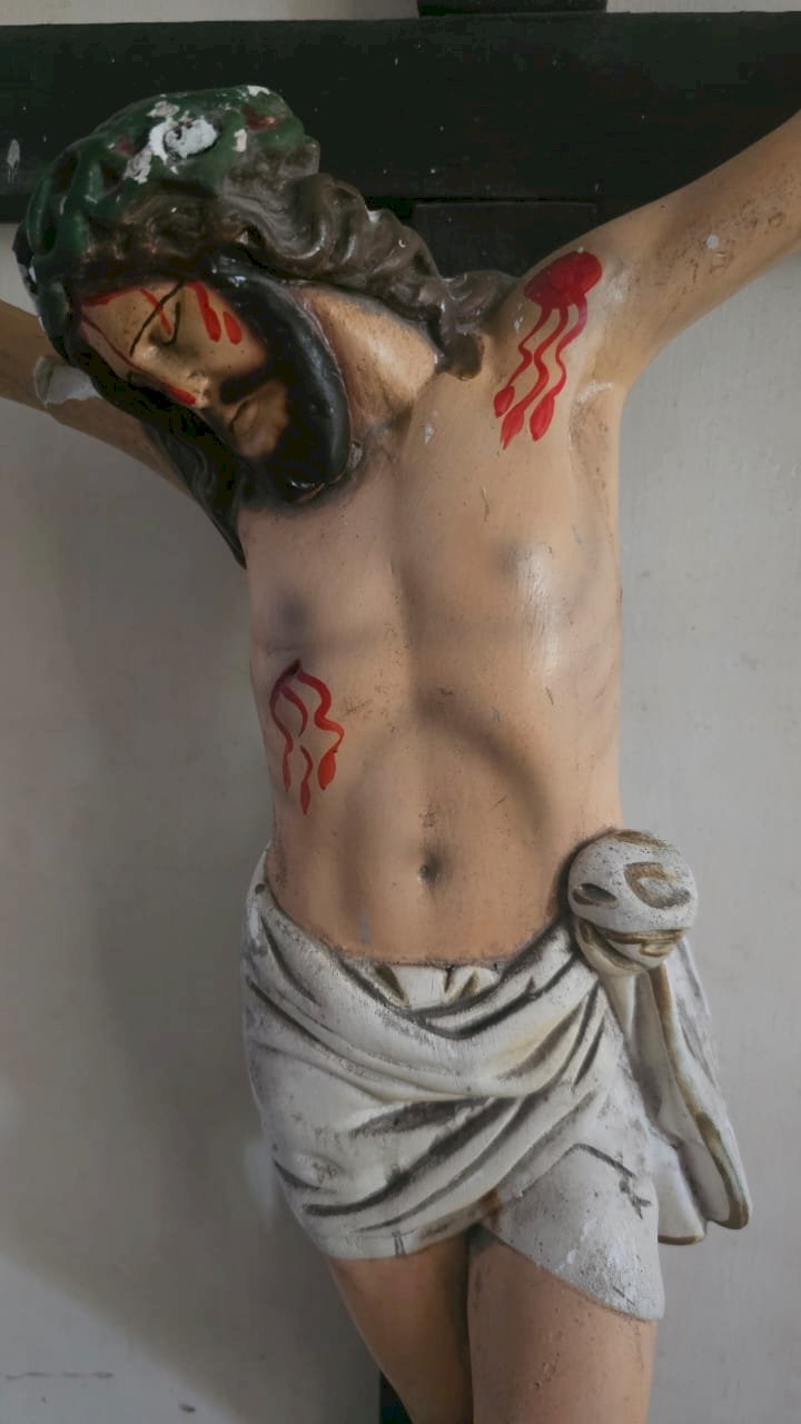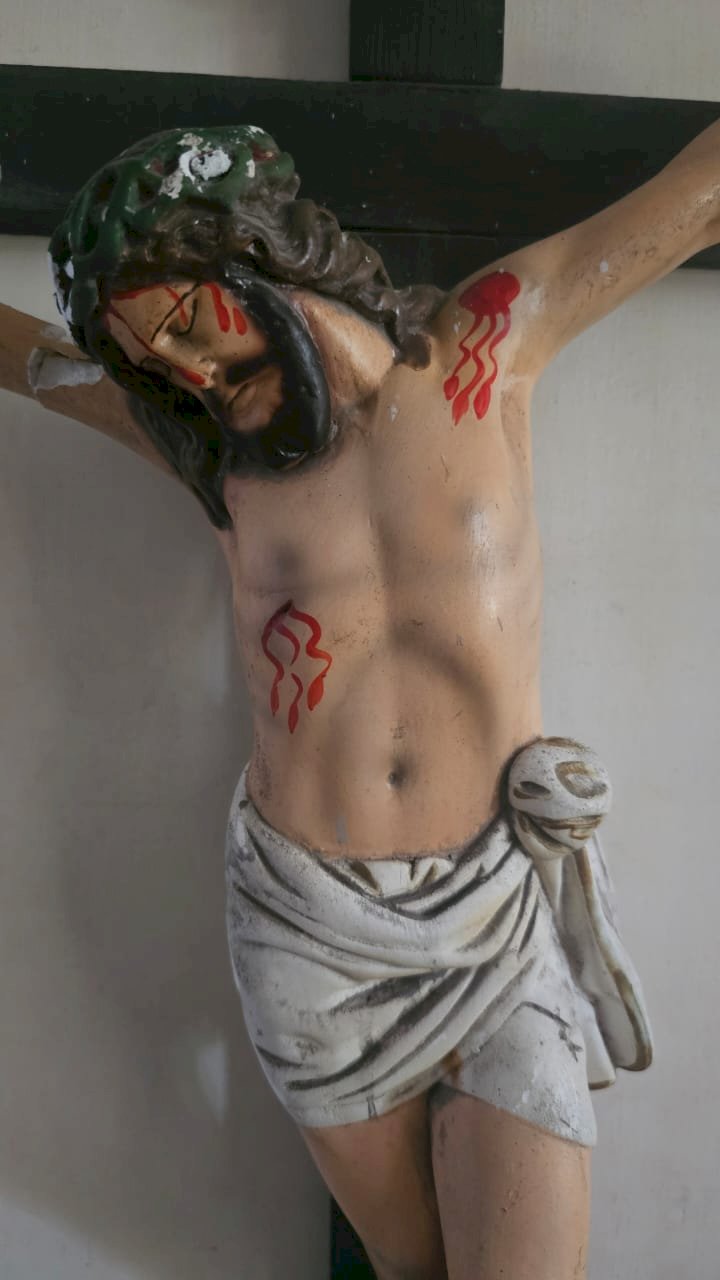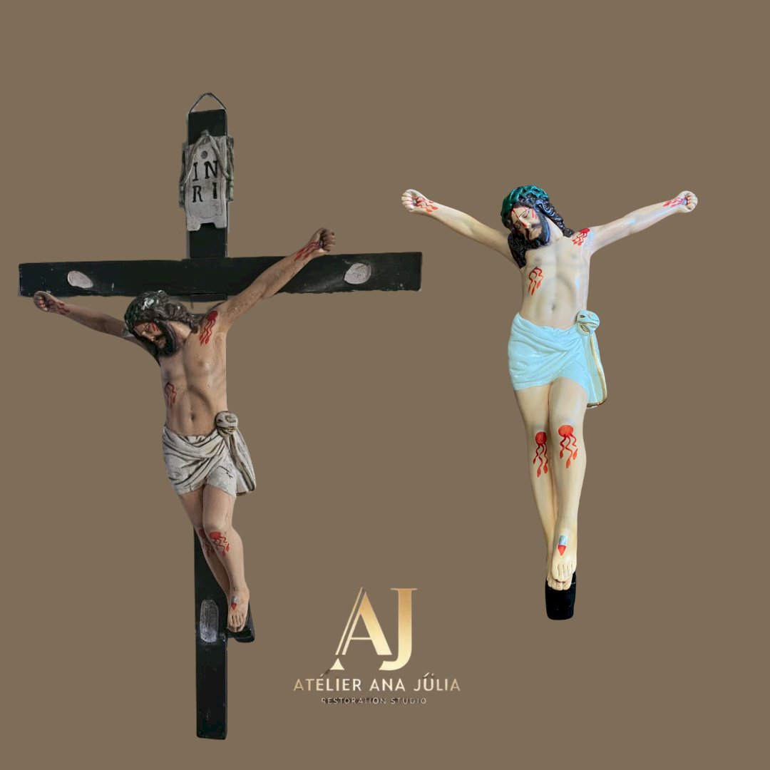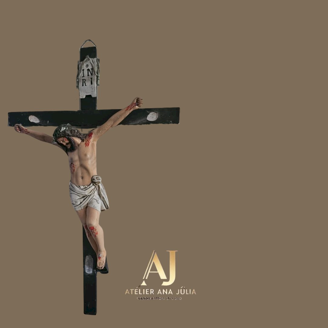 de madeira medindo 92 x 57 cm, com jesus em gesso medindo 52 x 42 – desmontagem e remontagem, limpeza geral, revitalização da madeira, reconstrução de partes do braço direito com remoção de marcas, remoção de lascados, retoques nas peles, cabelo e coroa, repintura da veste com envelhecimento, repintura da placa INRI, redouramento dos elementos da placa INRI, fixação dos dois braços no crucifixo