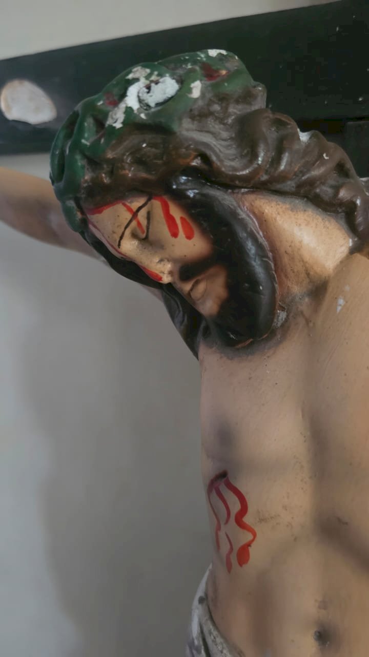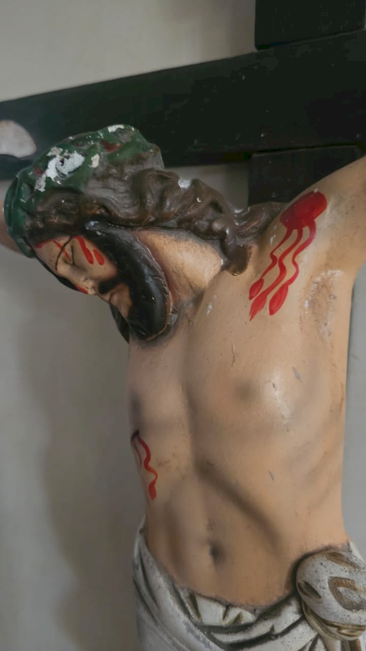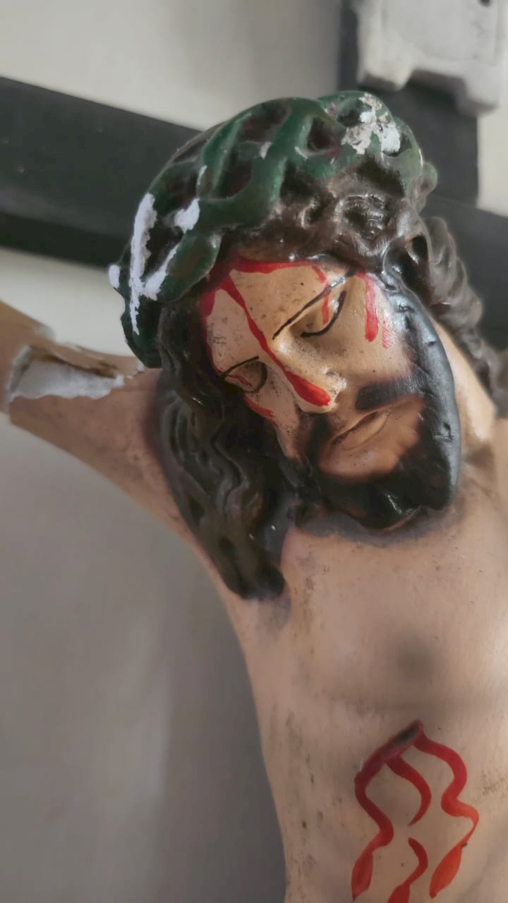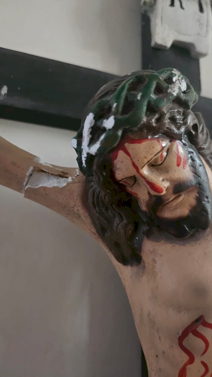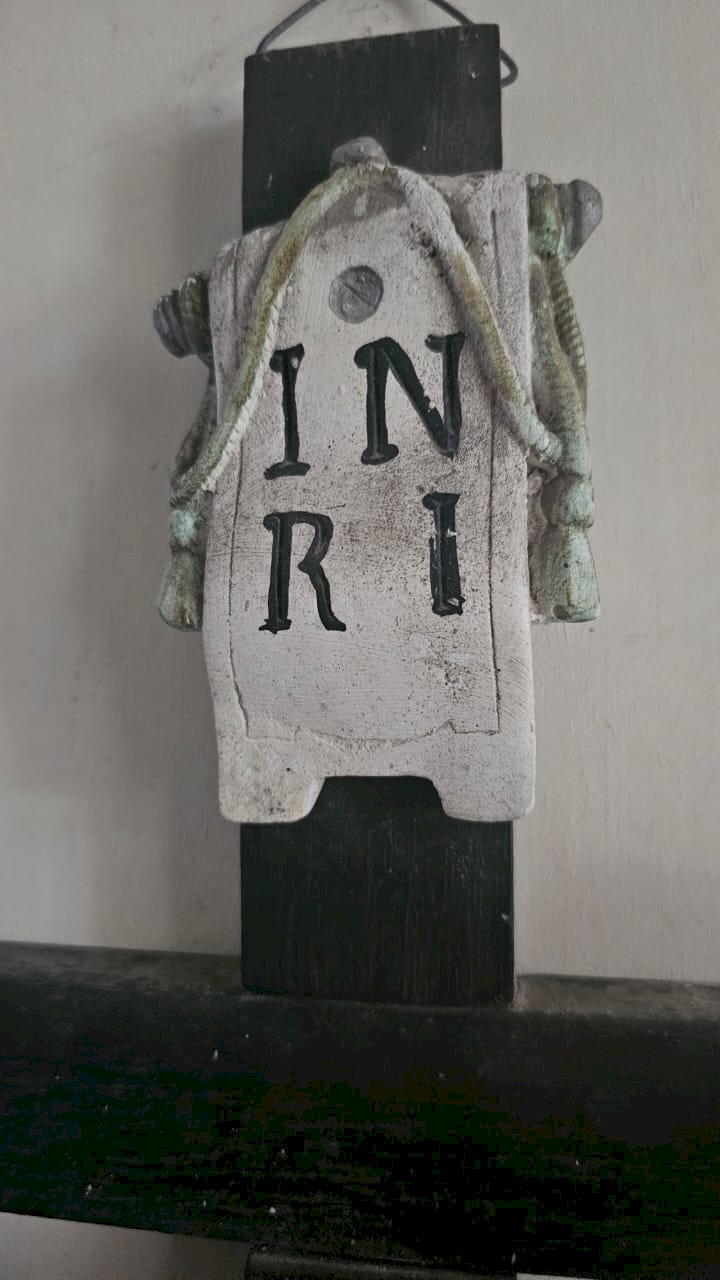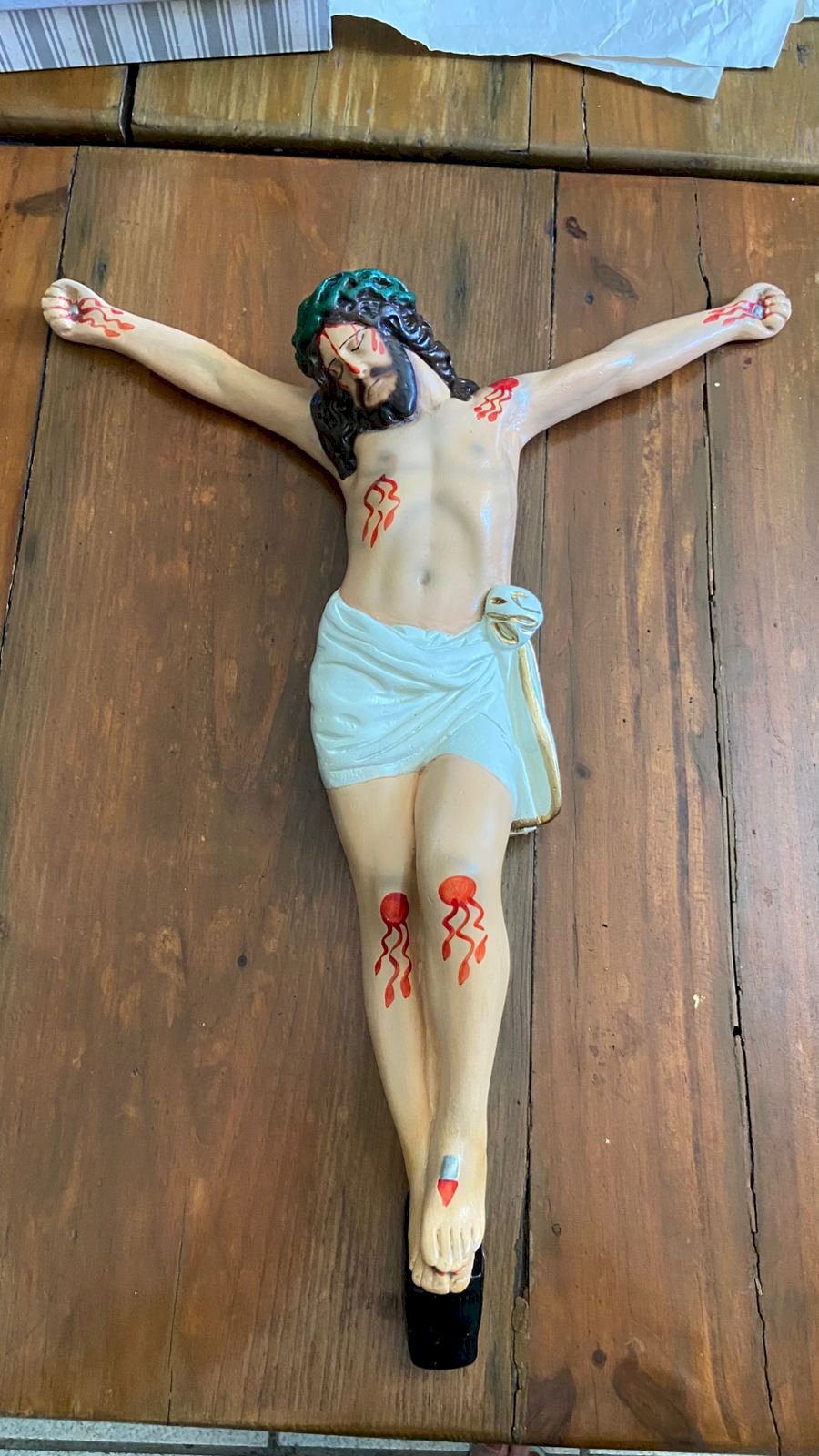 de madeira medindo 92 x 57 cm, com jesus em gesso medindo 52 x 42 – desmontagem e remontagem, limpeza geral, revitalização da madeira, reconstrução de partes do braço direito com remoção de marcas, remoção de lascados, retoques nas peles, cabelo e coroa, repintura da veste com envelhecimento, repintura da placa INRI, redouramento dos elementos da placa INRI, fixação dos dois braços no crucifixo