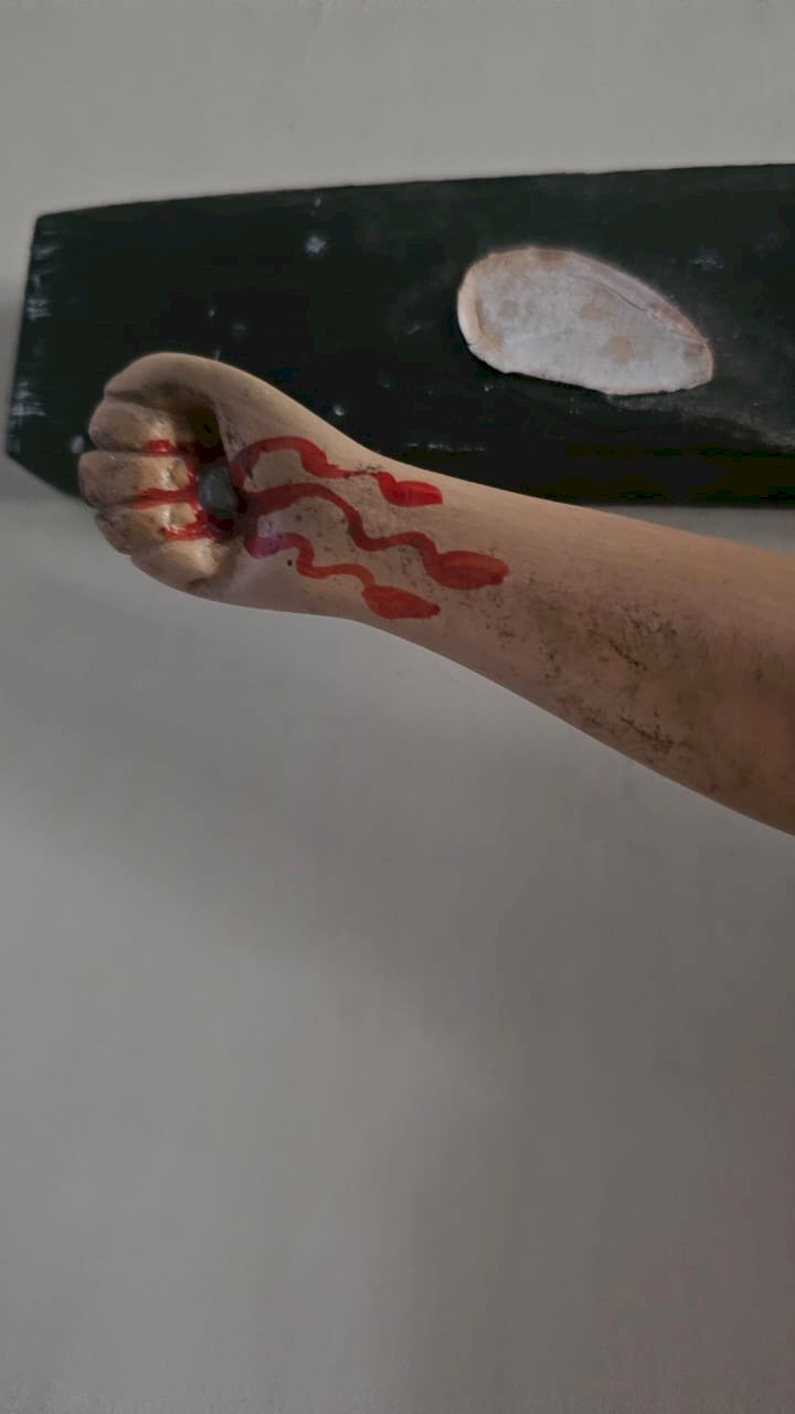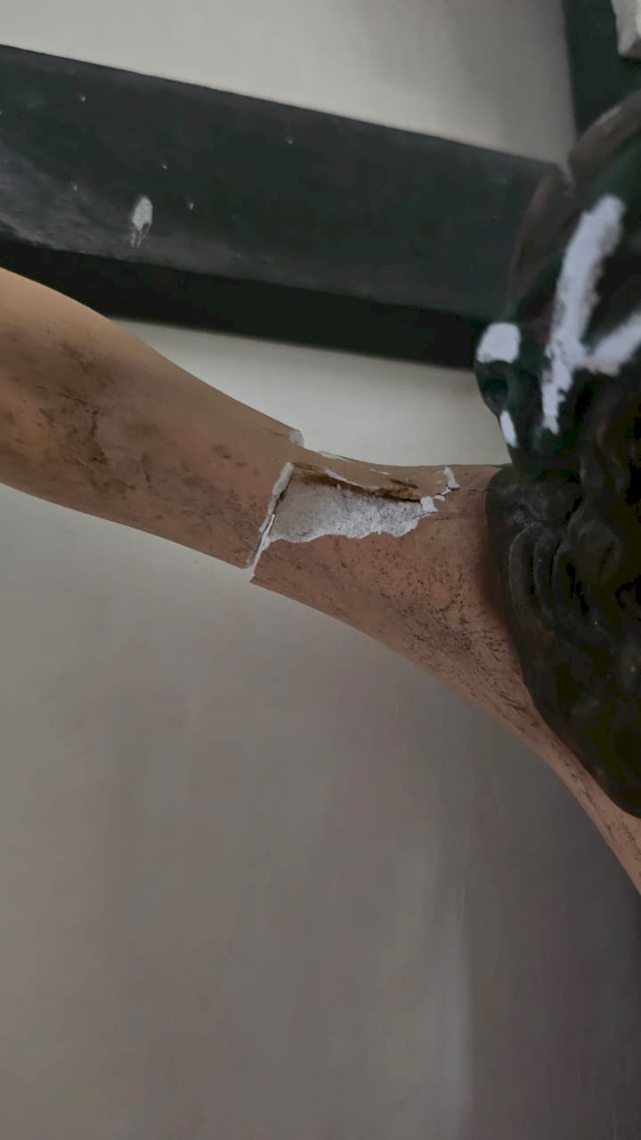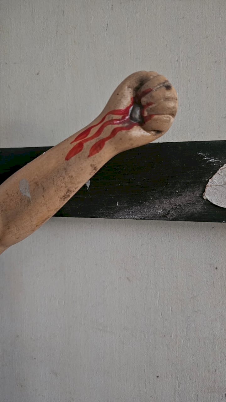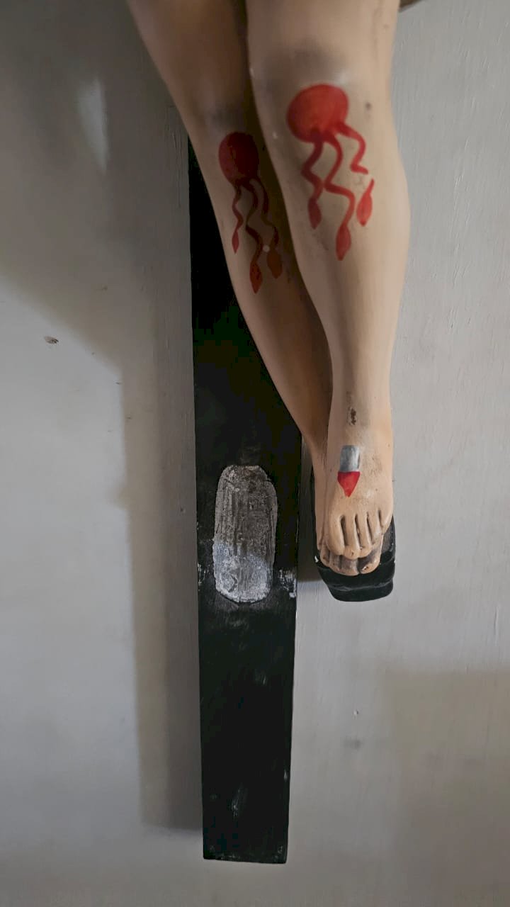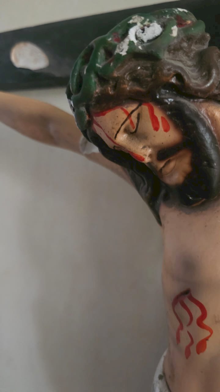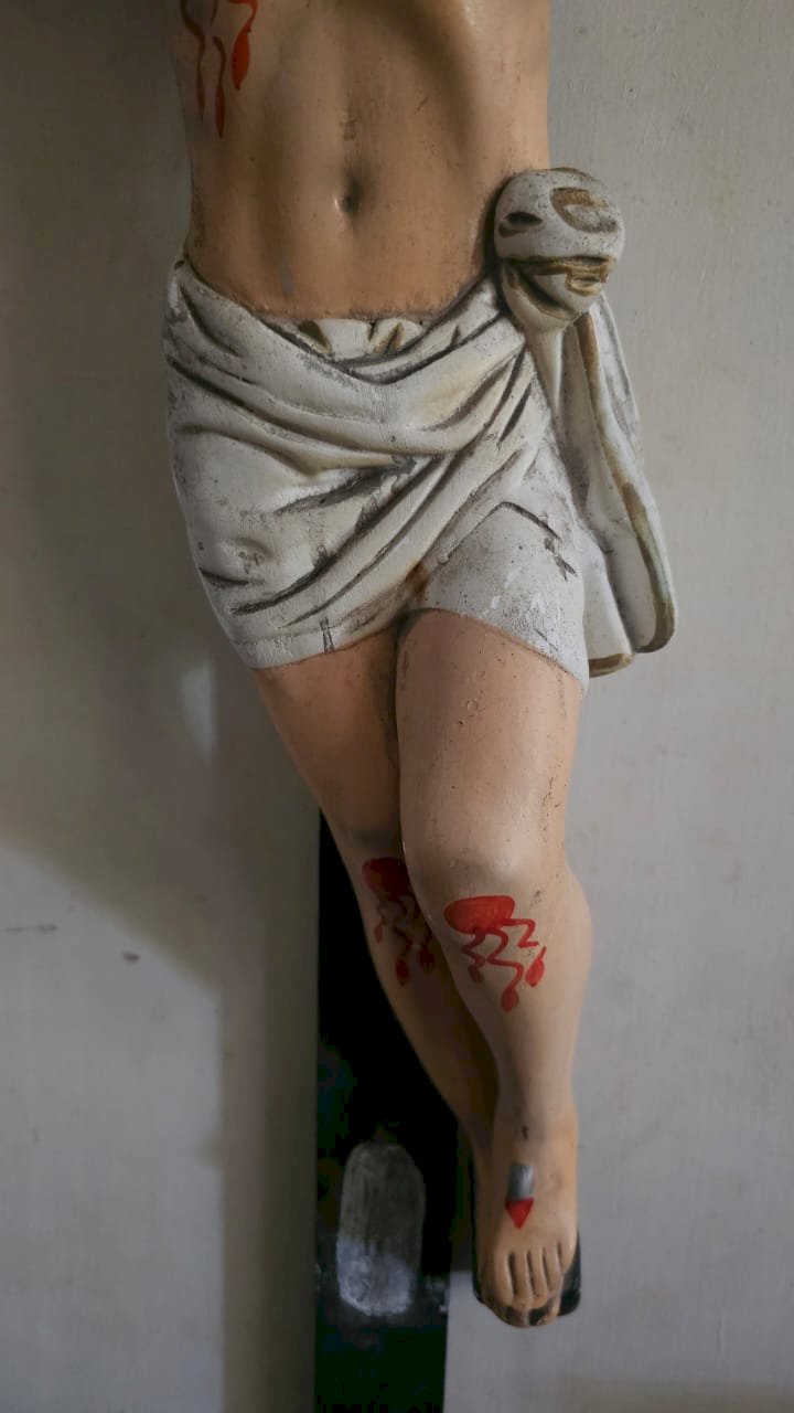 de madeira medindo 92 x 57 cm, com jesus em gesso medindo 52 x 42 – desmontagem e remontagem, limpeza geral, revitalização da madeira, reconstrução de partes do braço direito com remoção de marcas, remoção de lascados, retoques nas peles, cabelo e coroa, repintura da veste com envelhecimento, repintura da placa INRI, redouramento dos elementos da placa INRI, fixação dos dois braços no crucifixo