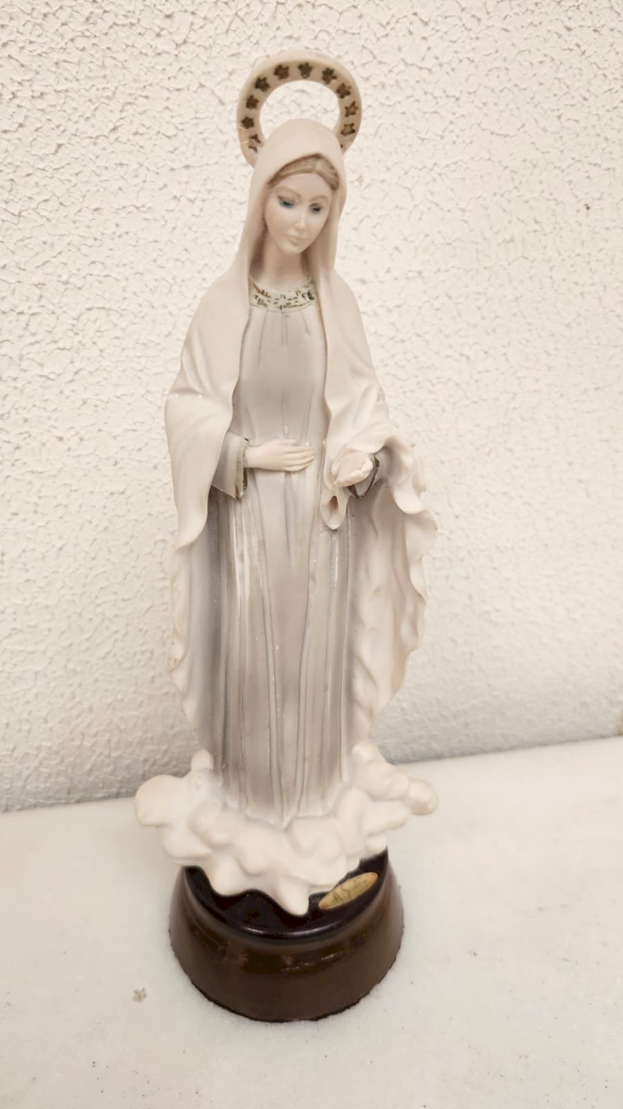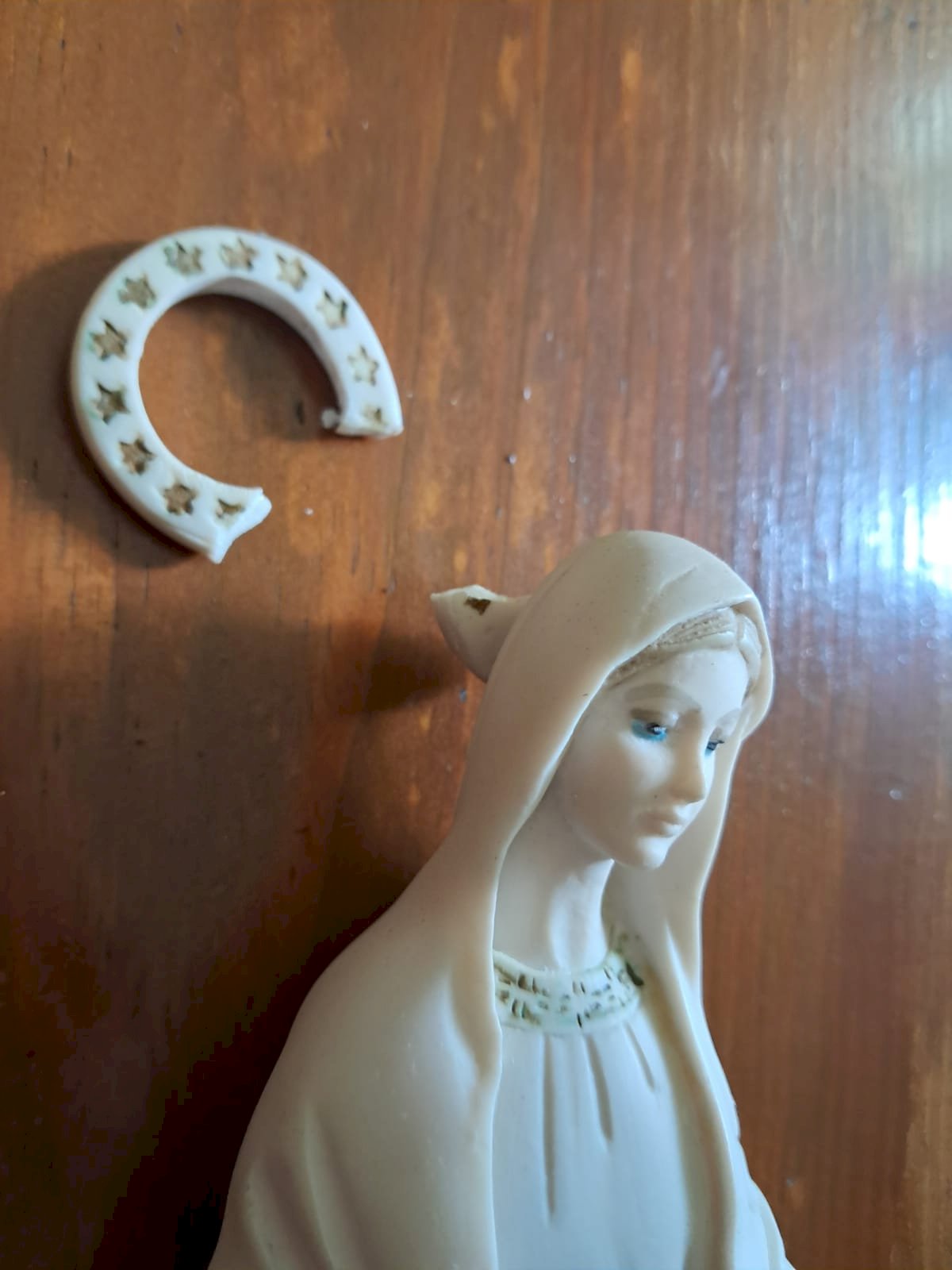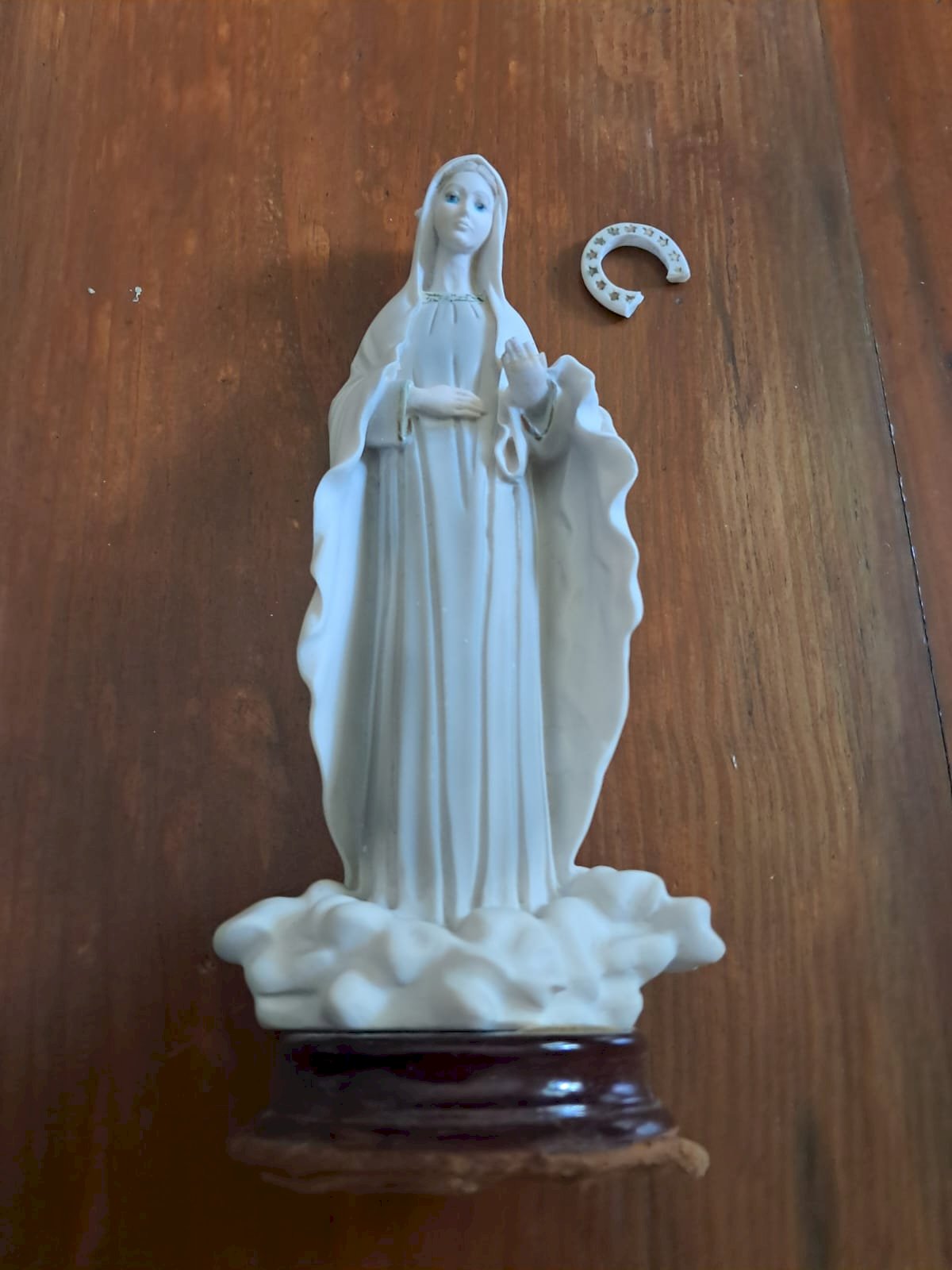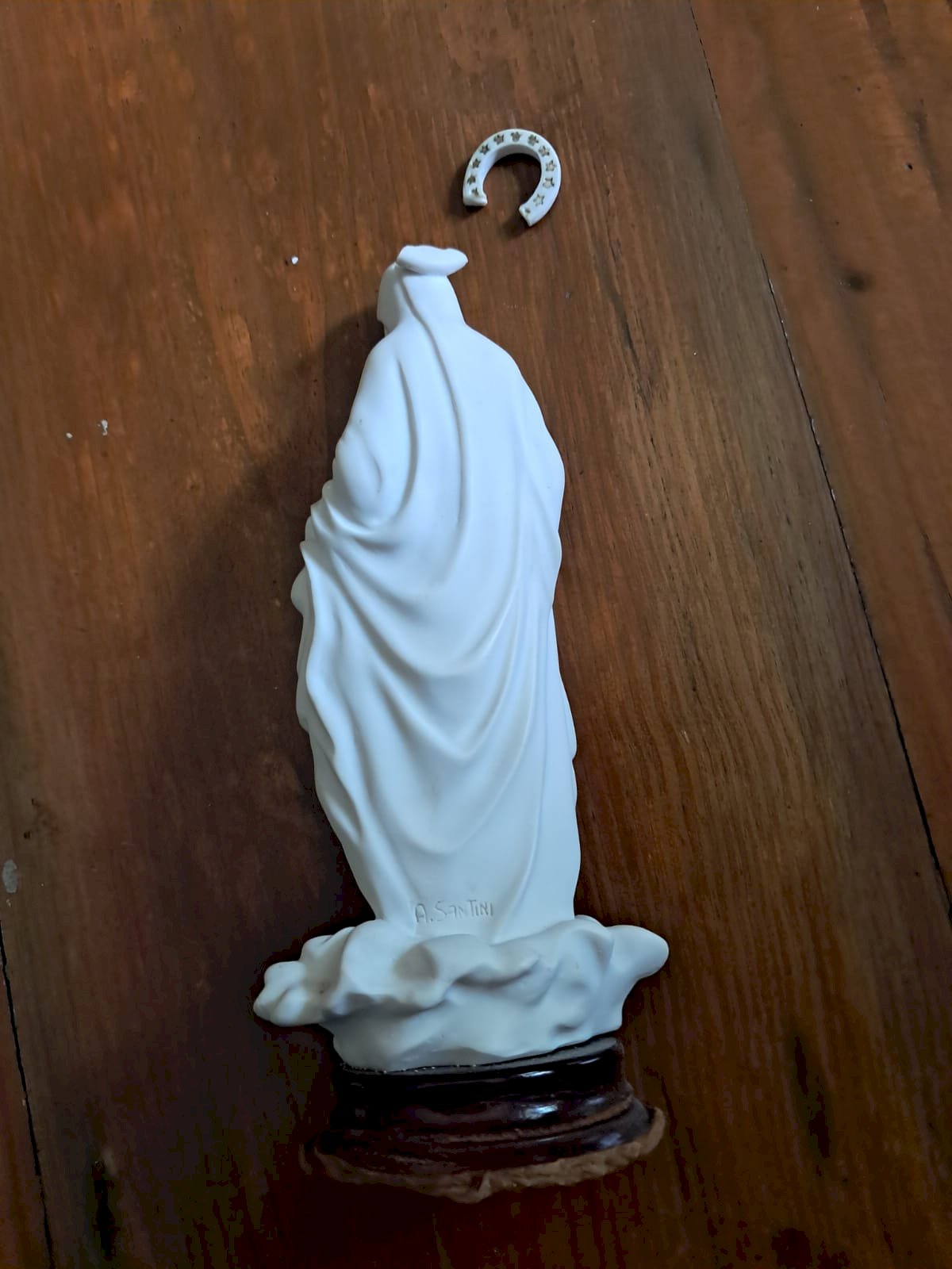 medindo 27 cm - reconstrução do dedo da mão esquerda, junção de partes da coroa de.estrelas, remoção de mdf na base que está estufado, acabamento da base com massa plastica e fixação de feltro no fundo