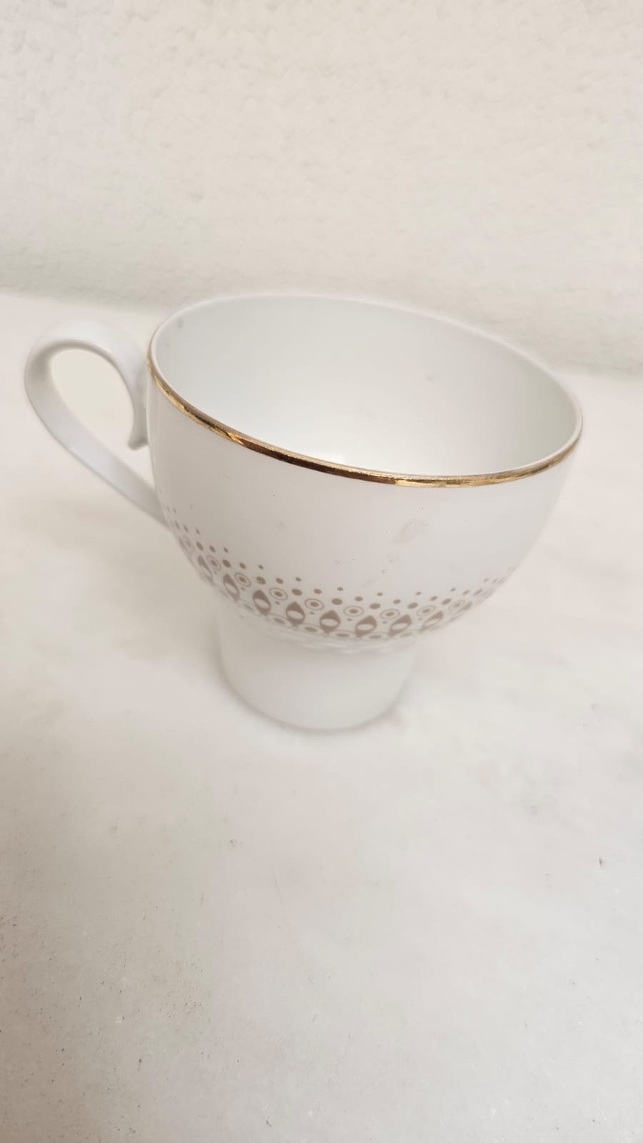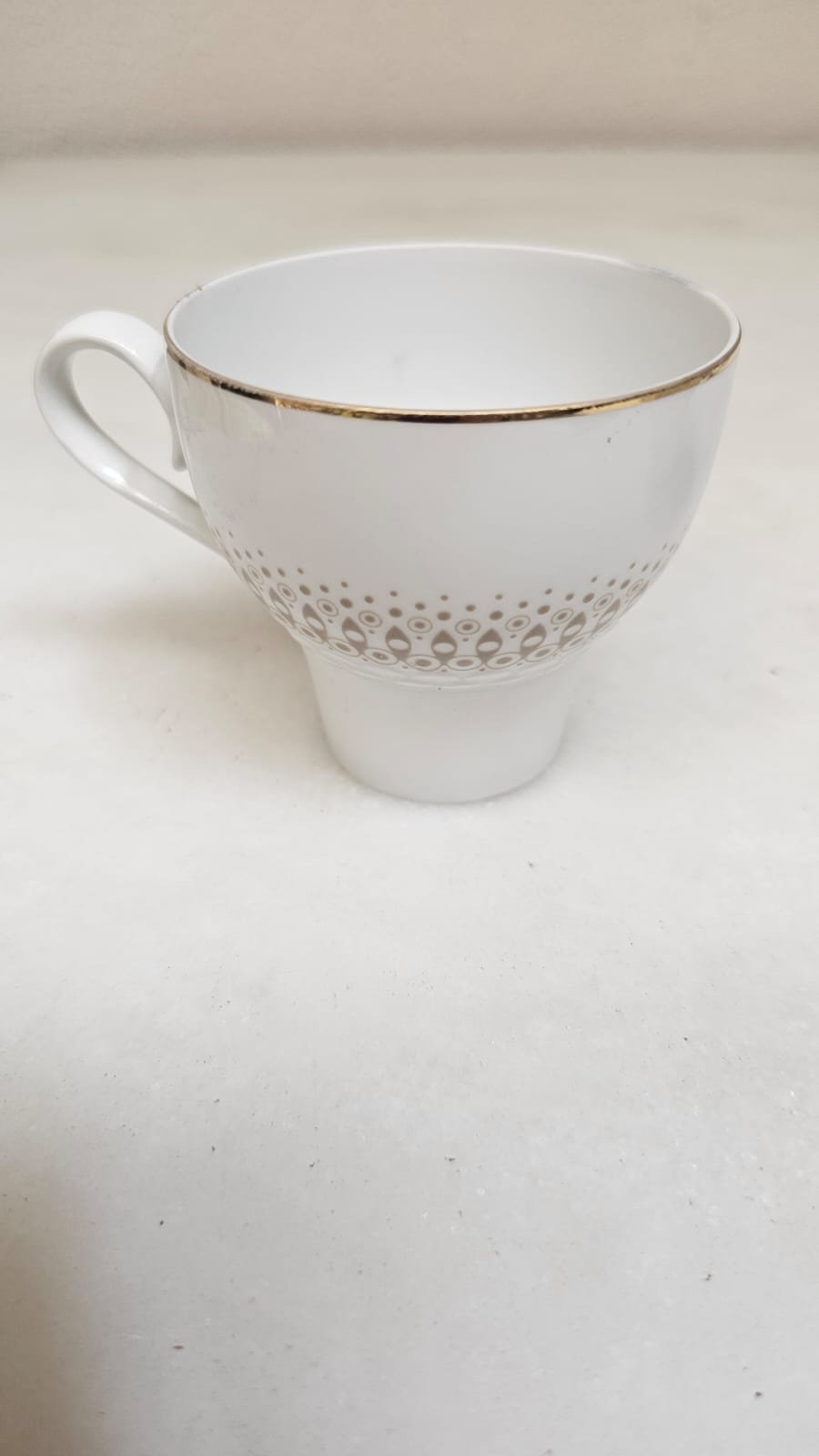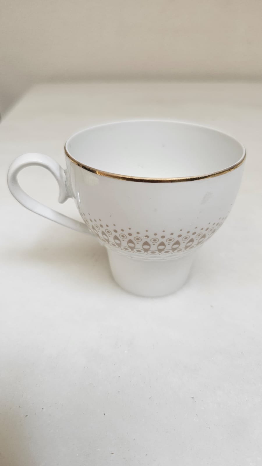 1. *Xícara* - de porcelana para chá -  Reconstrução do fundo, com remoção de marcas, repintura nas linhas de colagem com vitrificação a frio