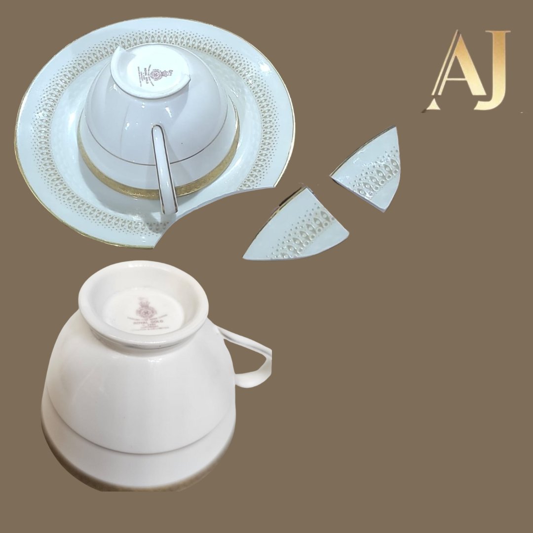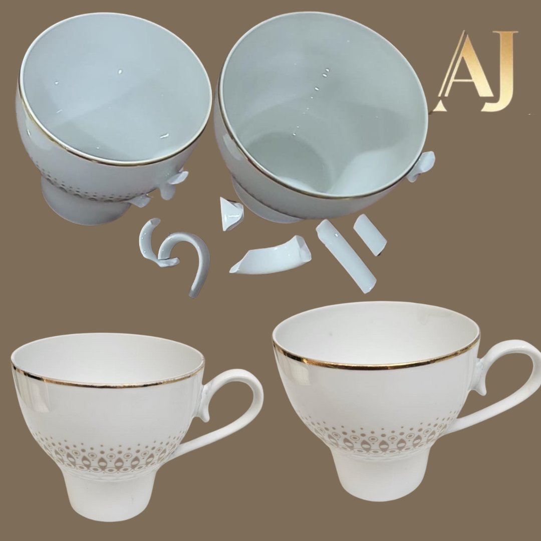 1. *Xícara* - de porcelana para café -  Reconstrução da alça com remoção de marcas, repintura nas linhas de colagem com vitrificação a frio