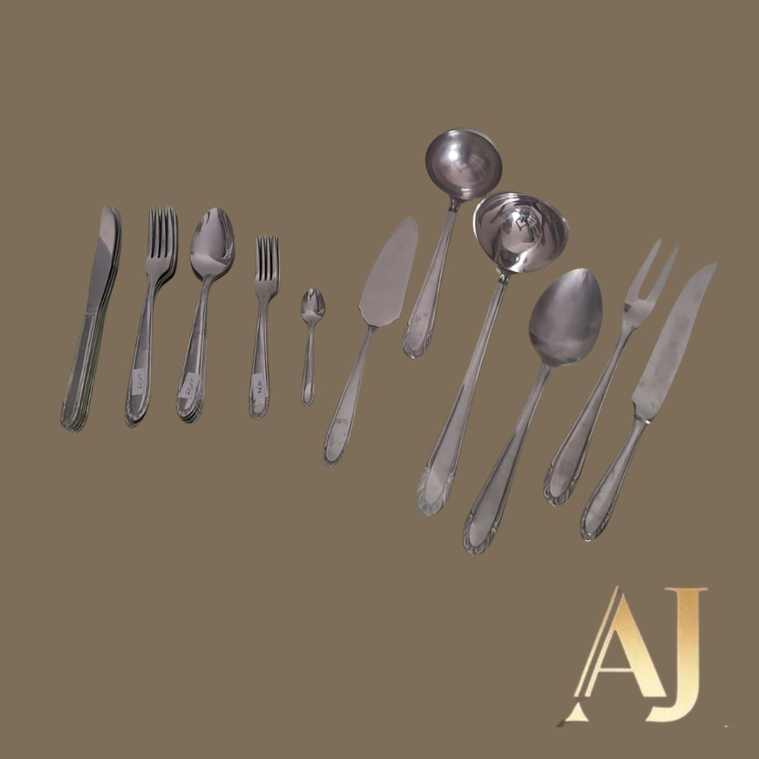Faqueiro inox Meridional com 60 peças: 6 colheres de café, 12 colheres de sopa, 12 facas, 12 garfos, 12 garfos de sobremesa, 12 facas de sobremesa, 1 concha grande, 1 concha, 1 colher de servir, 1 espátula, 1 garfo de servir e uma faca de servir.