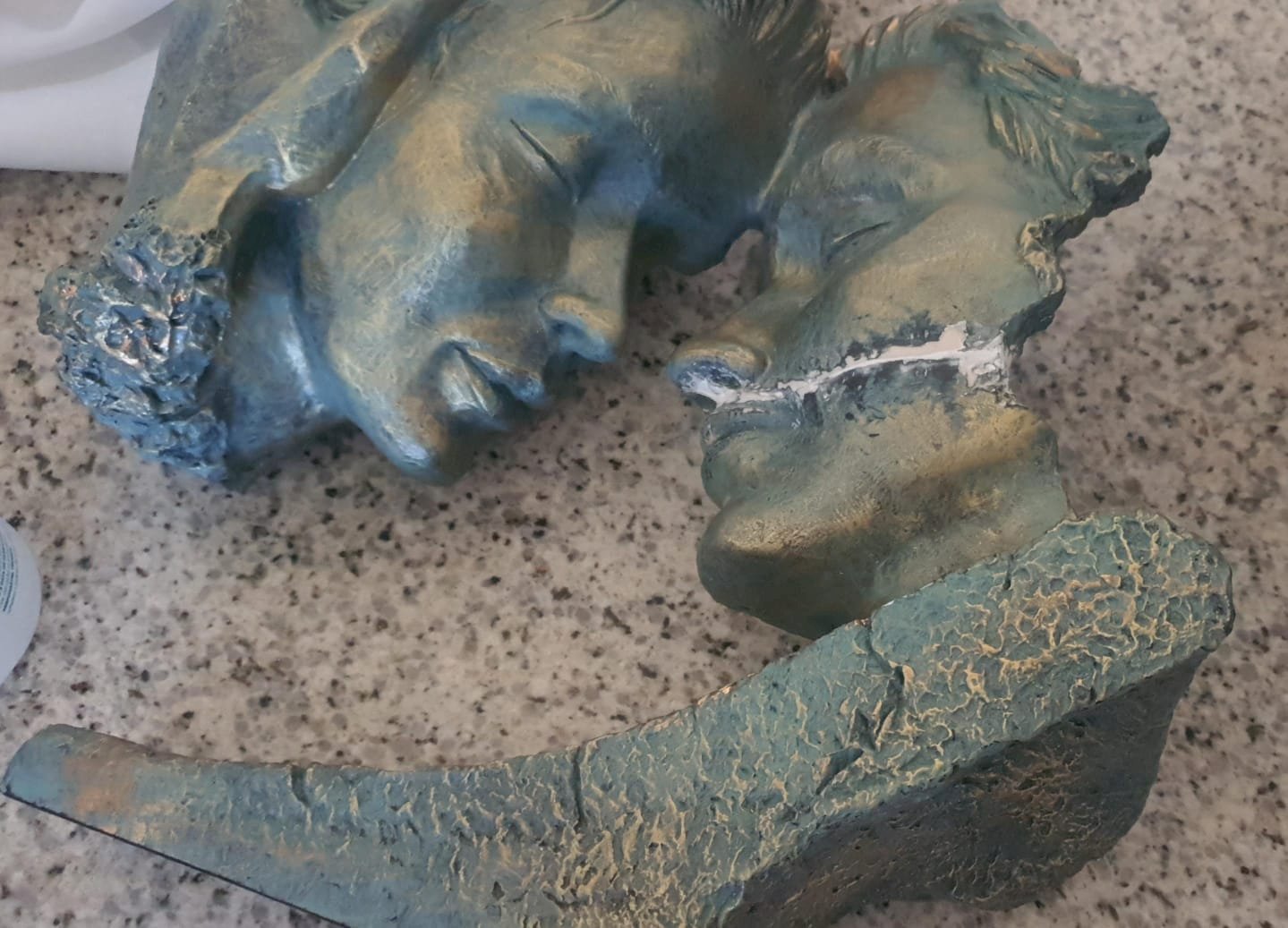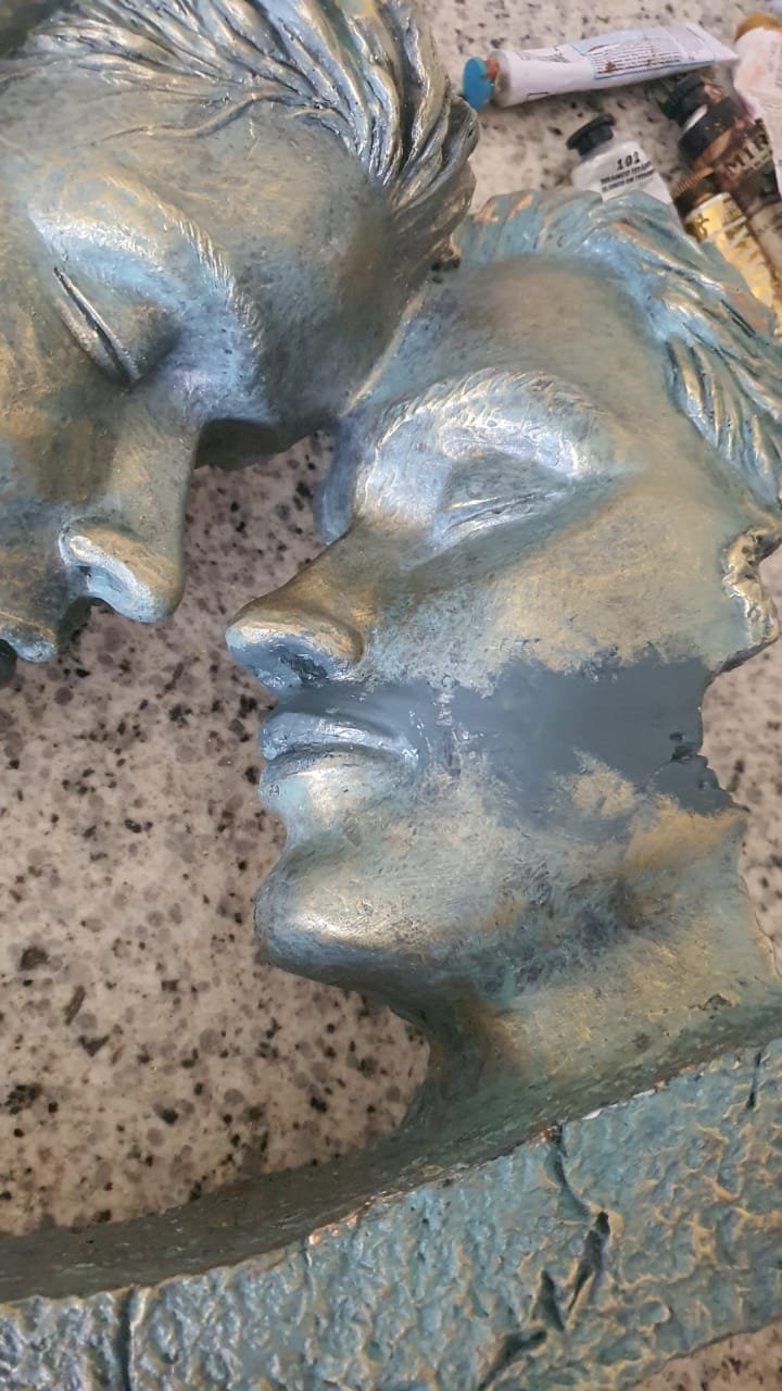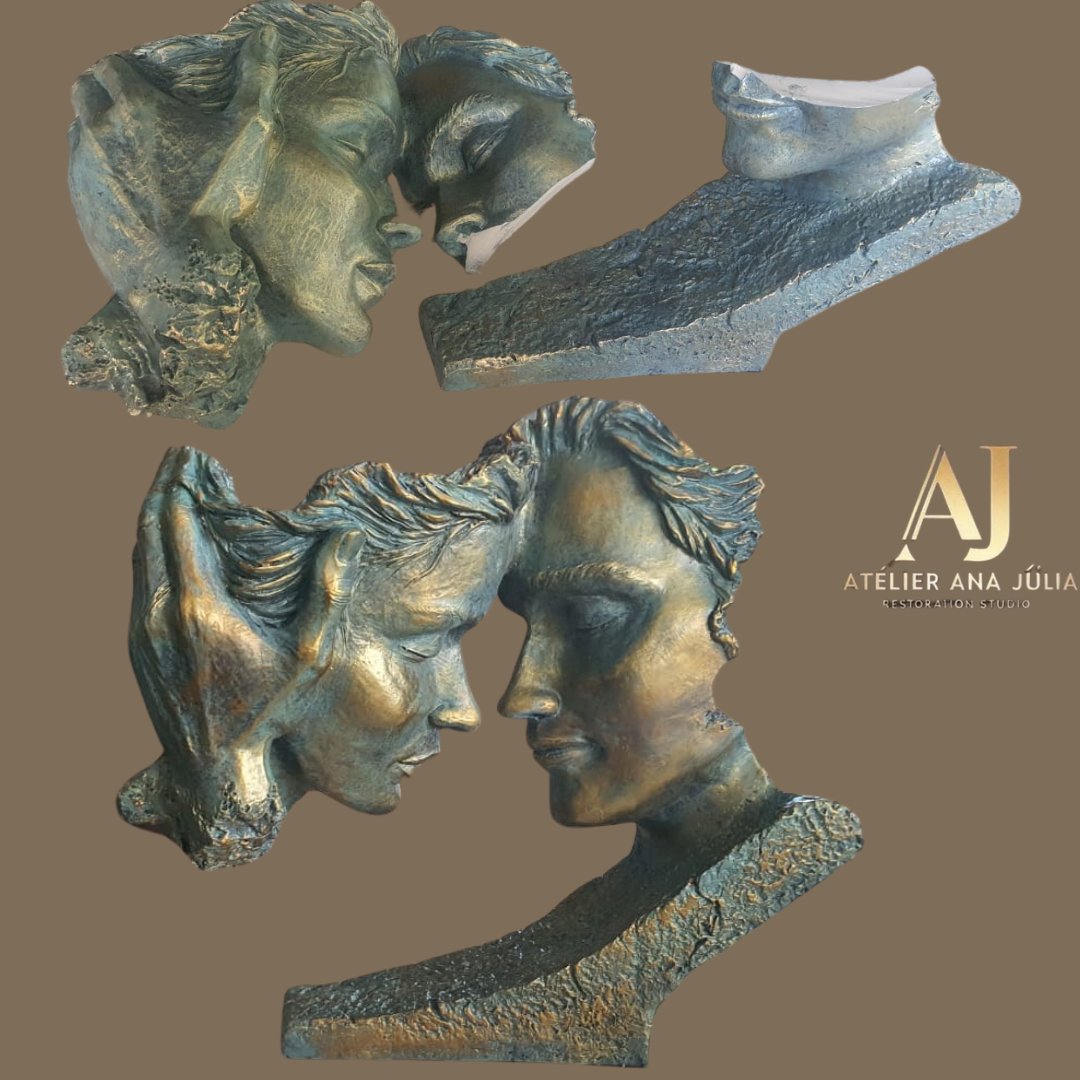 Parafusamento dos dois pedaços para sustentação, Junção das partes apartadas, Reconstrução do pedaço que falta, Colagem com remoçao de marcas, Repintura nas linhas de colagem e no pedaço reconstruido