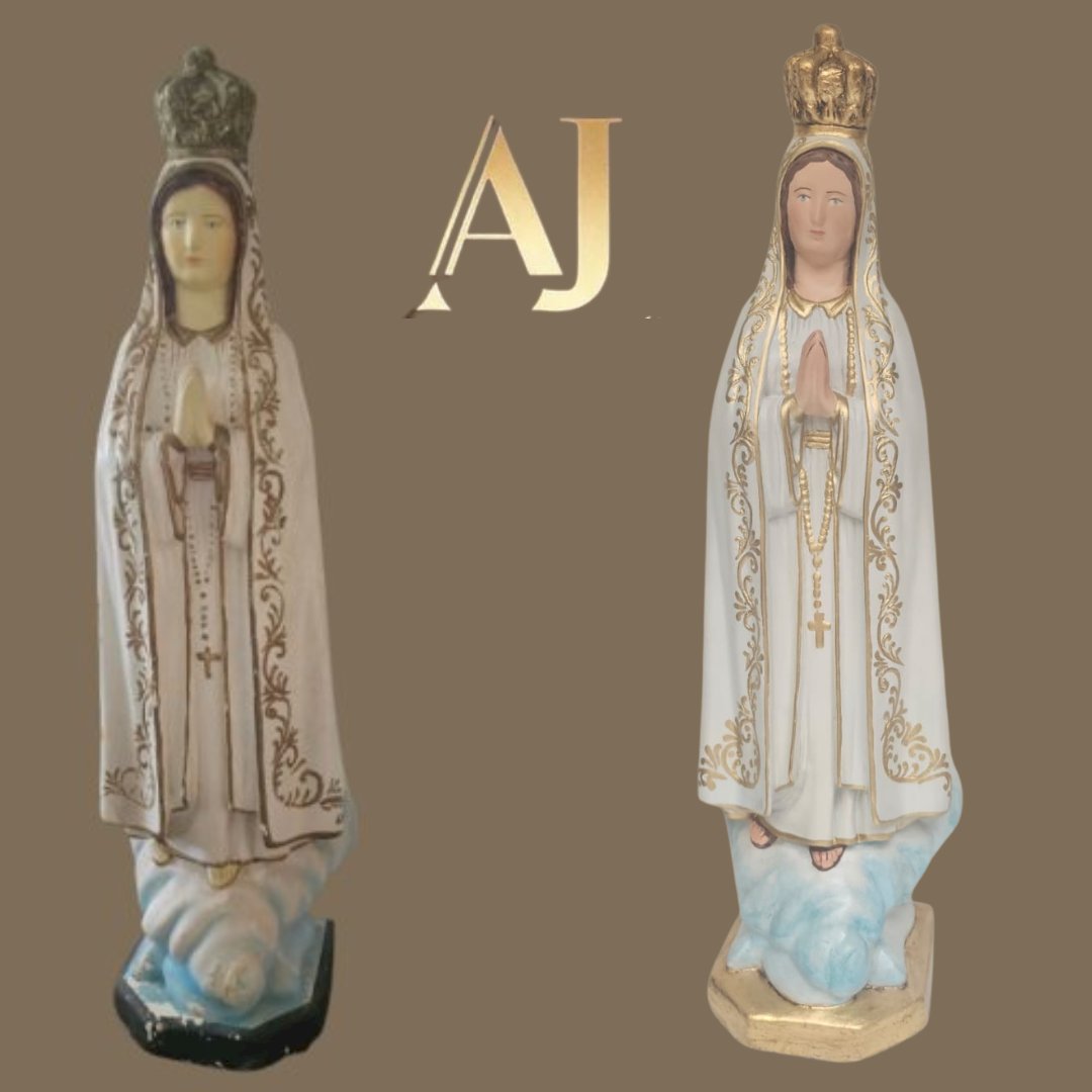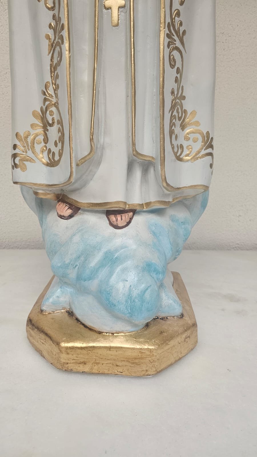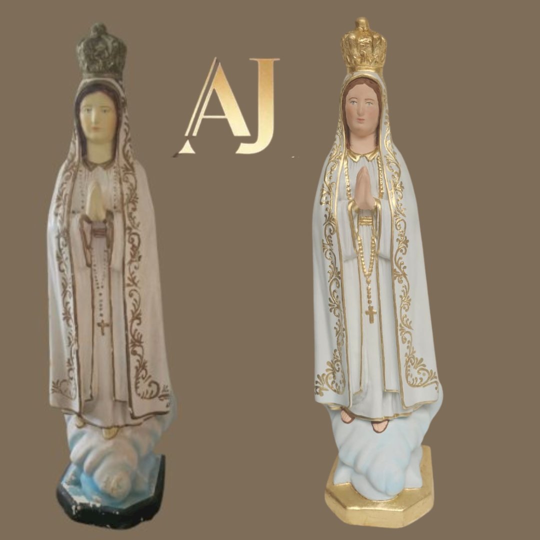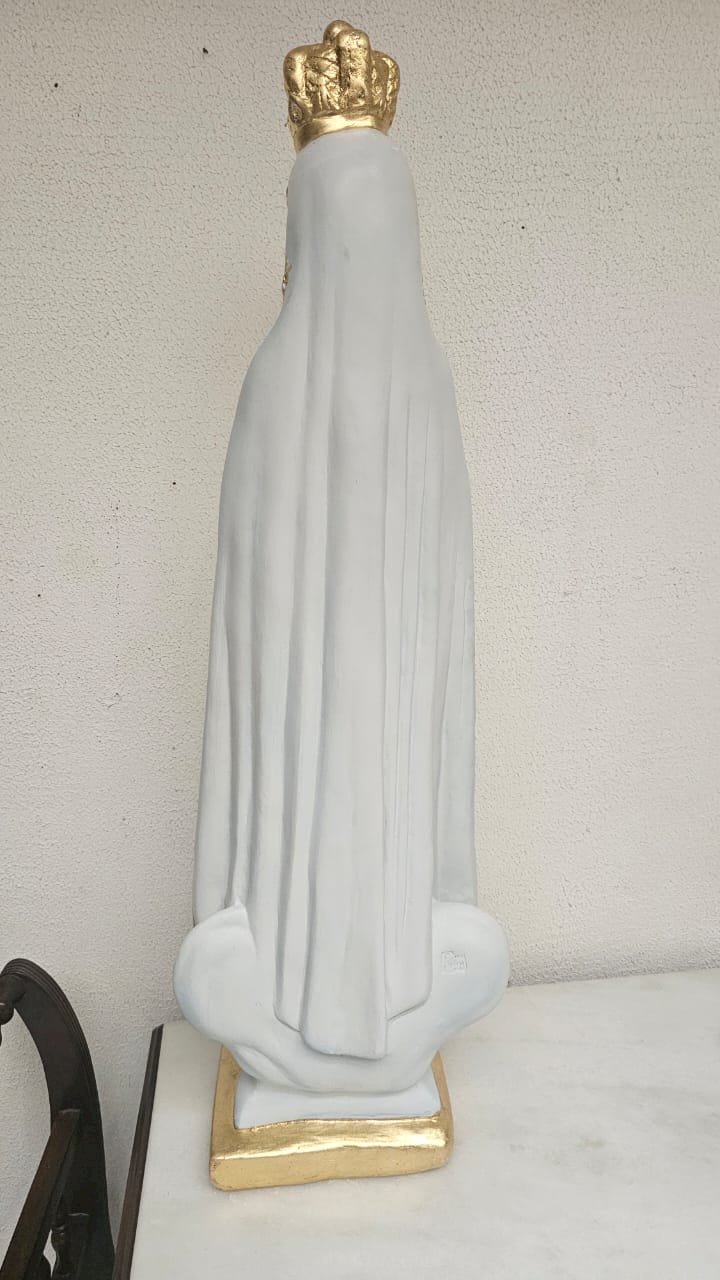 em gesso,  medindo 99 cm - limpeza Geral,  remoção de lascados, cavidades e trincados, repintura do manto branco, com leve sombreamento azul),  repintura do céu,  retoque nas peles com sombreamento rosado (boca, mãos, pés, rosto e pescoço),  retoques no cabelo, pintura da árvore verde abaixo do céu, repintura da base (amadeirada), redouramento da gola, punhos, cinto, parte do terço, sandália, contornos do manto e veste e arabescos do manto,  douramento da coroa com folha de ouro, preservar os olhos (*opcional* cortesia do atelier – dourar a base preta com folha de ouro)
