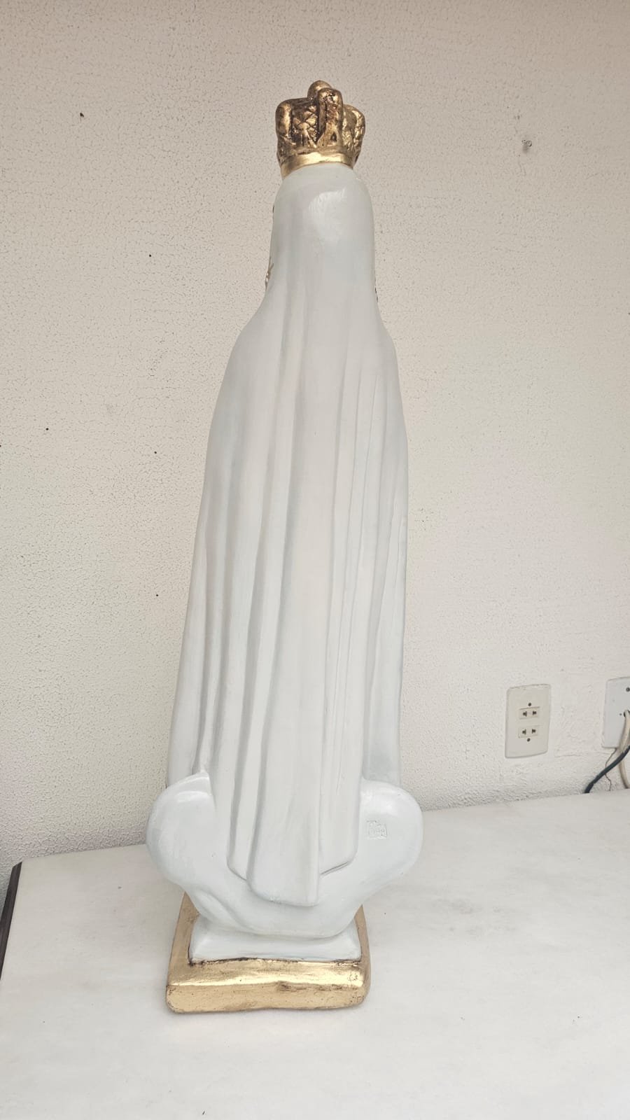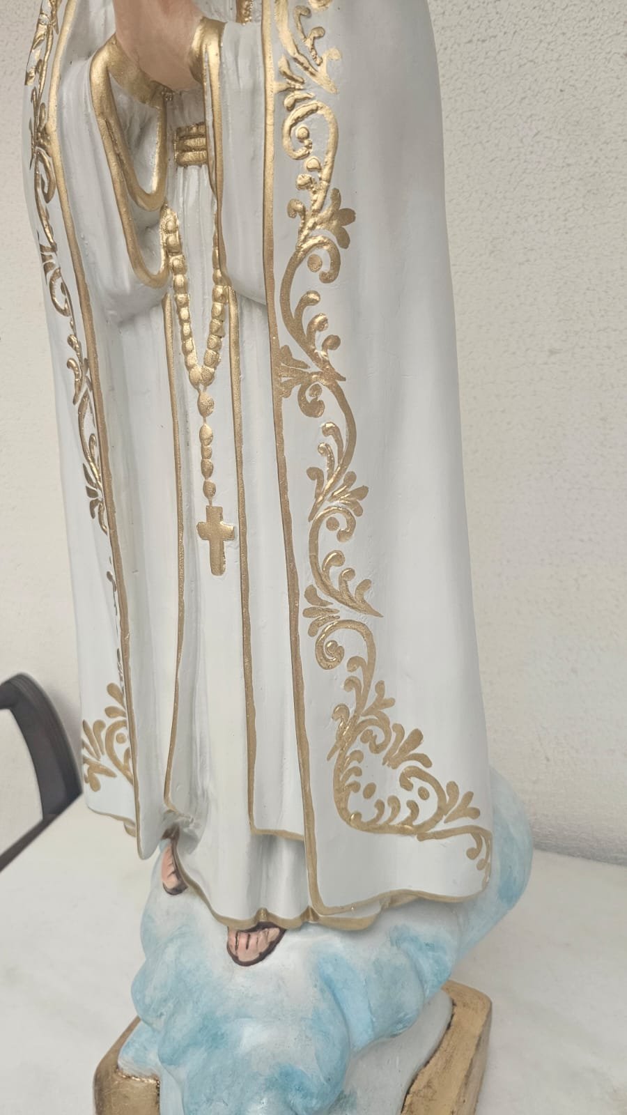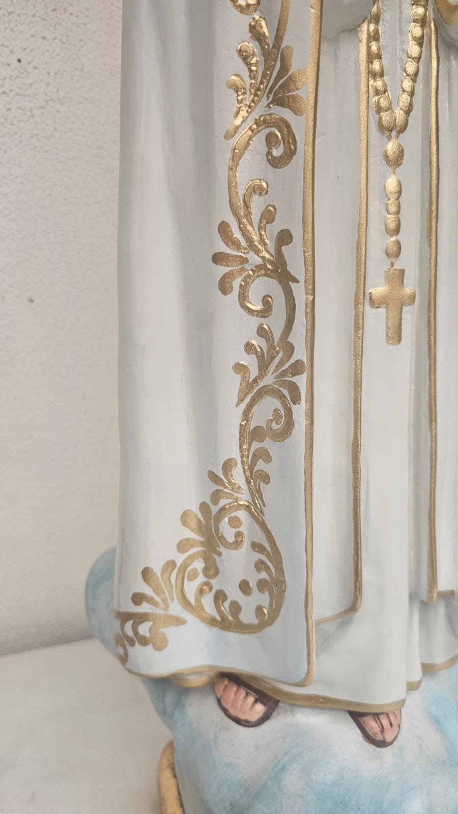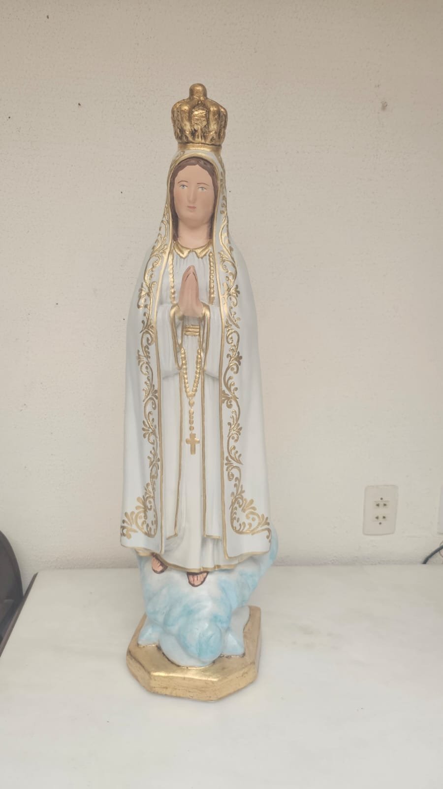 em gesso,  medindo 99 cm - limpeza Geral,  remoção de lascados, cavidades e trincados, repintura do manto branco, com leve sombreamento azul),  repintura do céu,  retoque nas peles com sombreamento rosado (boca, mãos, pés, rosto e pescoço),  retoques no cabelo, pintura da árvore verde abaixo do céu, repintura da base (amadeirada), redouramento da gola, punhos, cinto, parte do terço, sandália, contornos do manto e veste e arabescos do manto,  douramento da coroa com folha de ouro, preservar os olhos (*opcional* cortesia do atelier – dourar a base preta com folha de ouro)