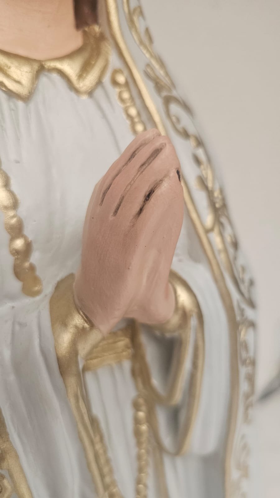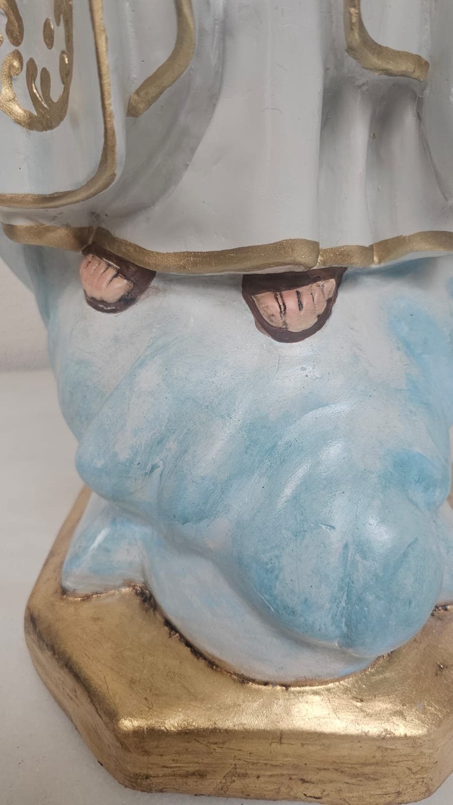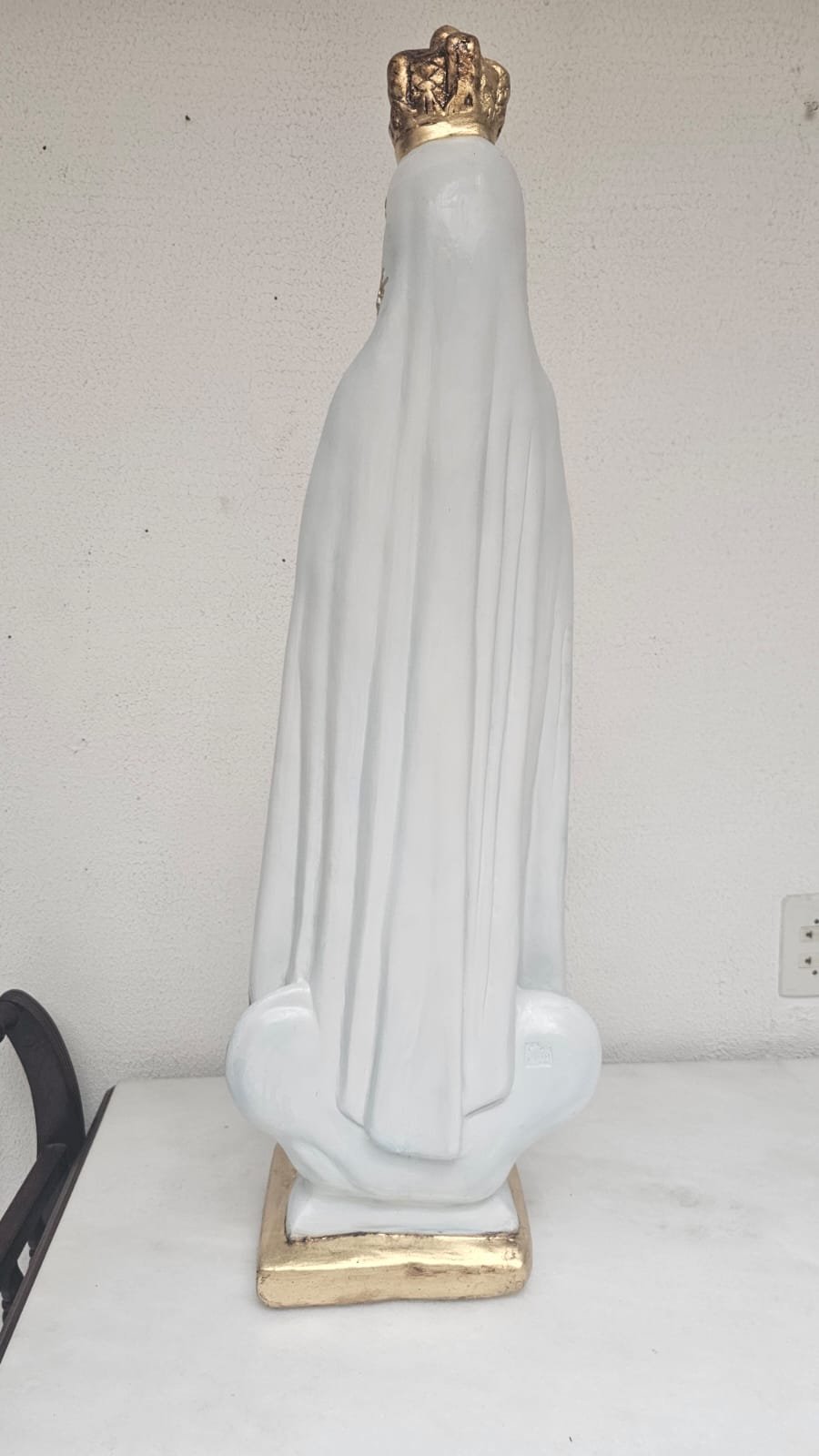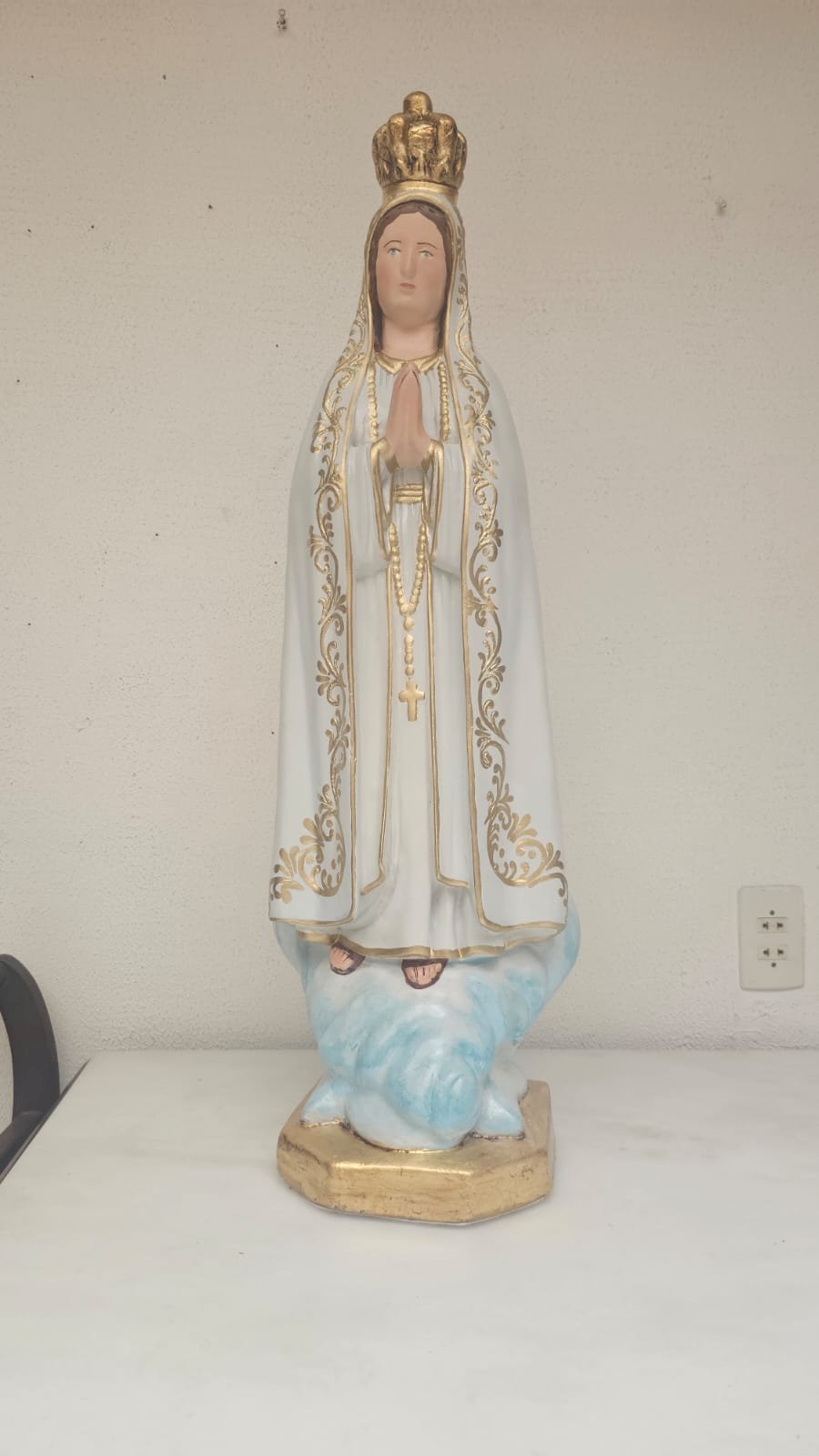 em gesso,  medindo 99 cm - limpeza Geral,  remoção de lascados, cavidades e trincados, repintura do manto branco, com leve sombreamento azul),  repintura do céu,  retoque nas peles com sombreamento rosado (boca, mãos, pés, rosto e pescoço),  retoques no cabelo, pintura da árvore verde abaixo do céu, repintura da base (amadeirada), redouramento da gola, punhos, cinto, parte do terço, sandália, contornos do manto e veste e arabescos do manto,  douramento da coroa com folha de ouro, preservar os olhos (*opcional* cortesia do atelier – dourar a base preta com folha de ouro)