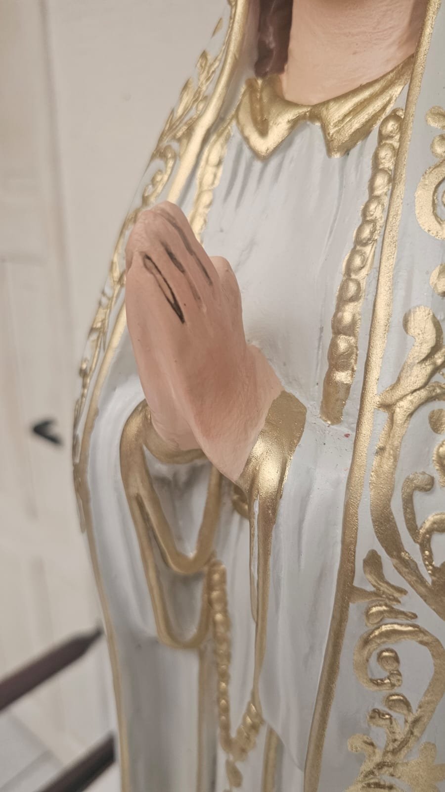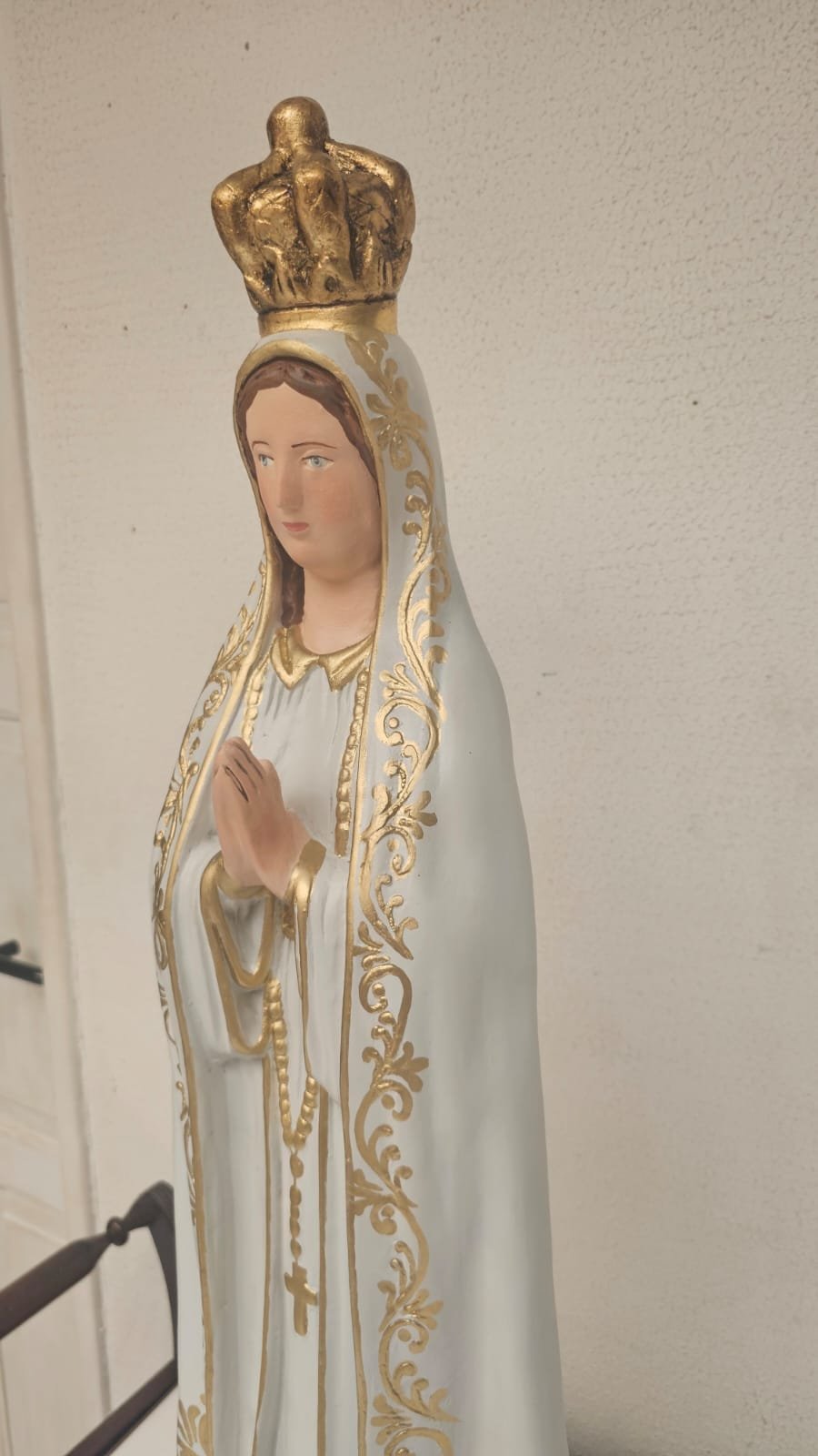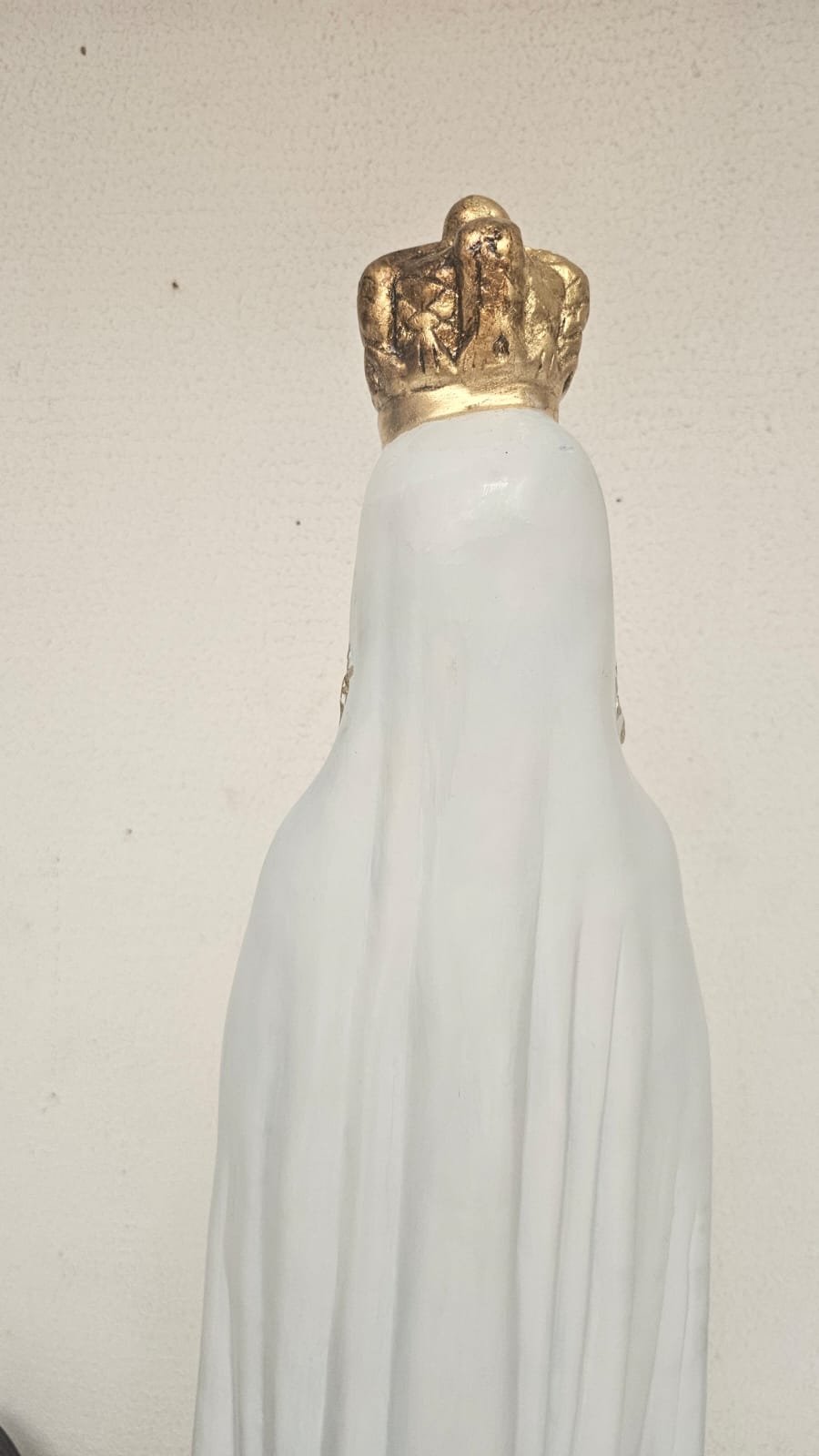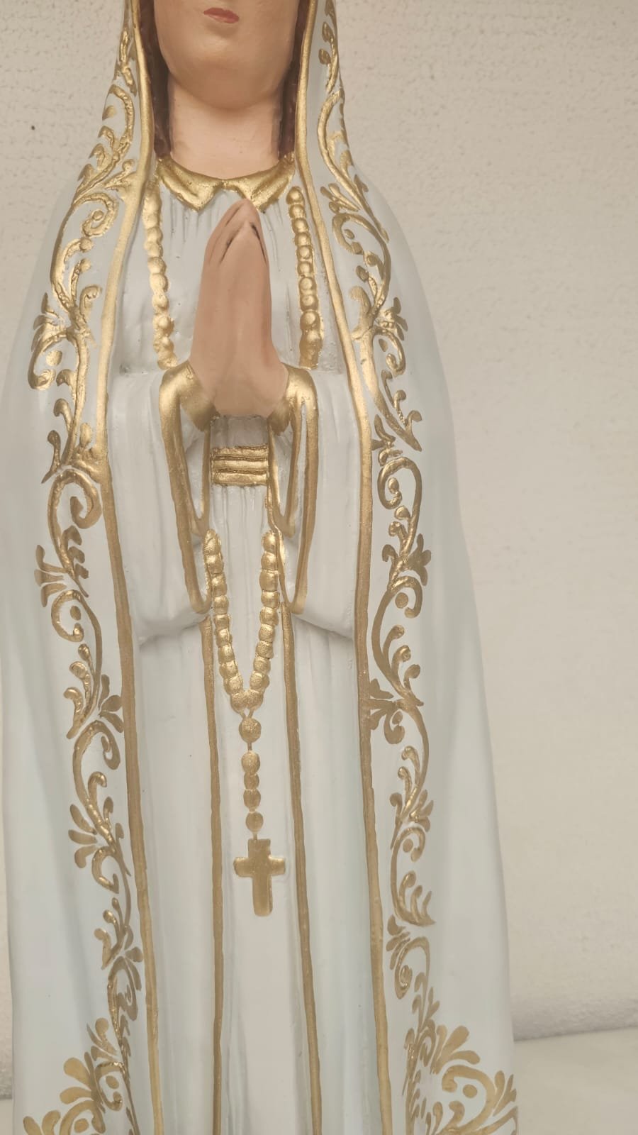 em gesso,  medindo 99 cm - limpeza Geral,  remoção de lascados, cavidades e trincados, repintura do manto branco, com leve sombreamento azul),  repintura do céu,  retoque nas peles com sombreamento rosado (boca, mãos, pés, rosto e pescoço),  retoques no cabelo, pintura da árvore verde abaixo do céu, repintura da base (amadeirada), redouramento da gola, punhos, cinto, parte do terço, sandália, contornos do manto e veste e arabescos do manto,  douramento da coroa com folha de ouro, preservar os olhos (*opcional* cortesia do atelier – dourar a base preta com folha de ouro)