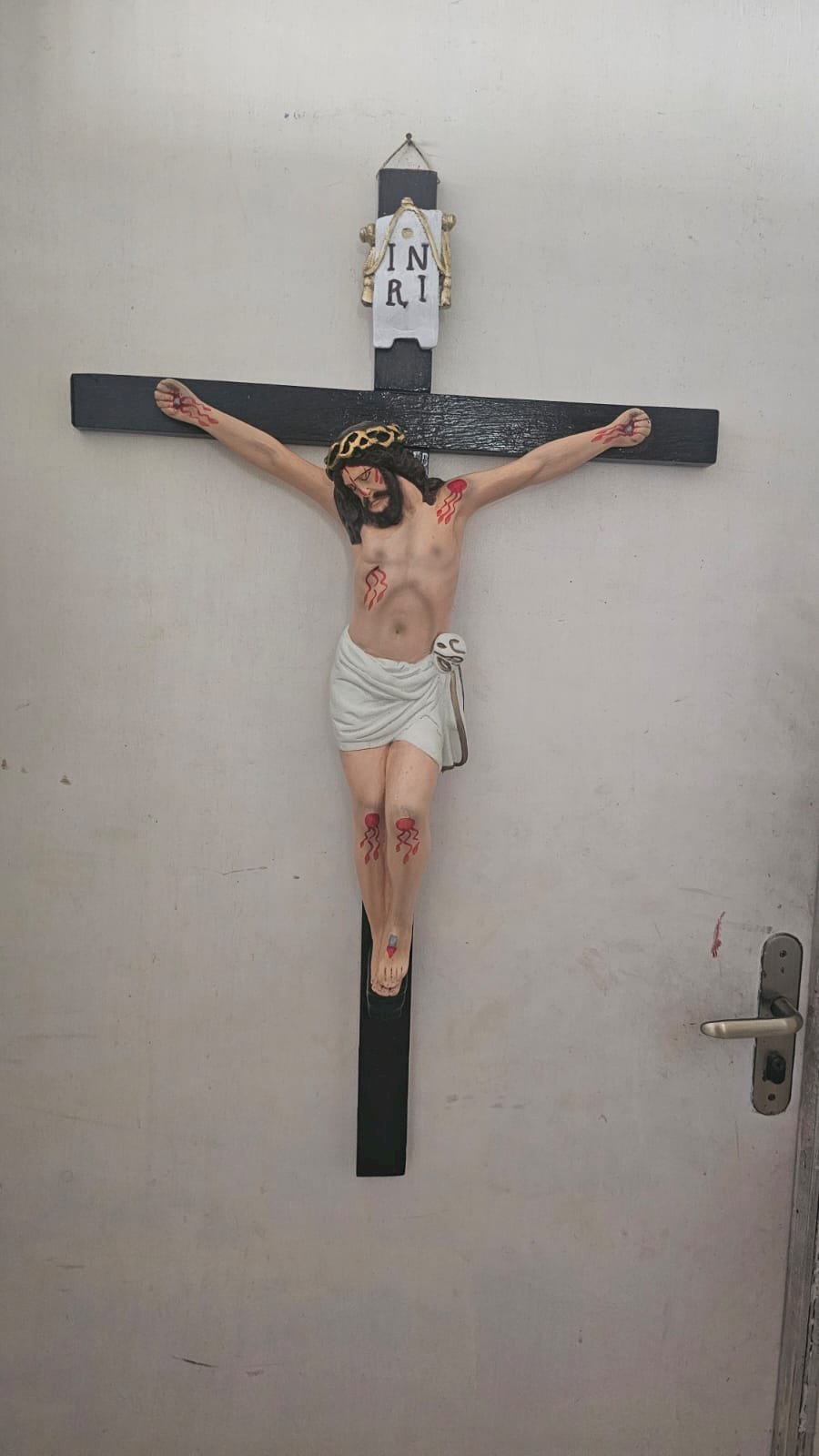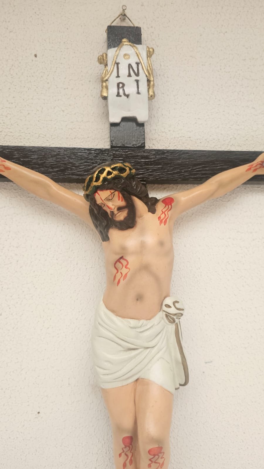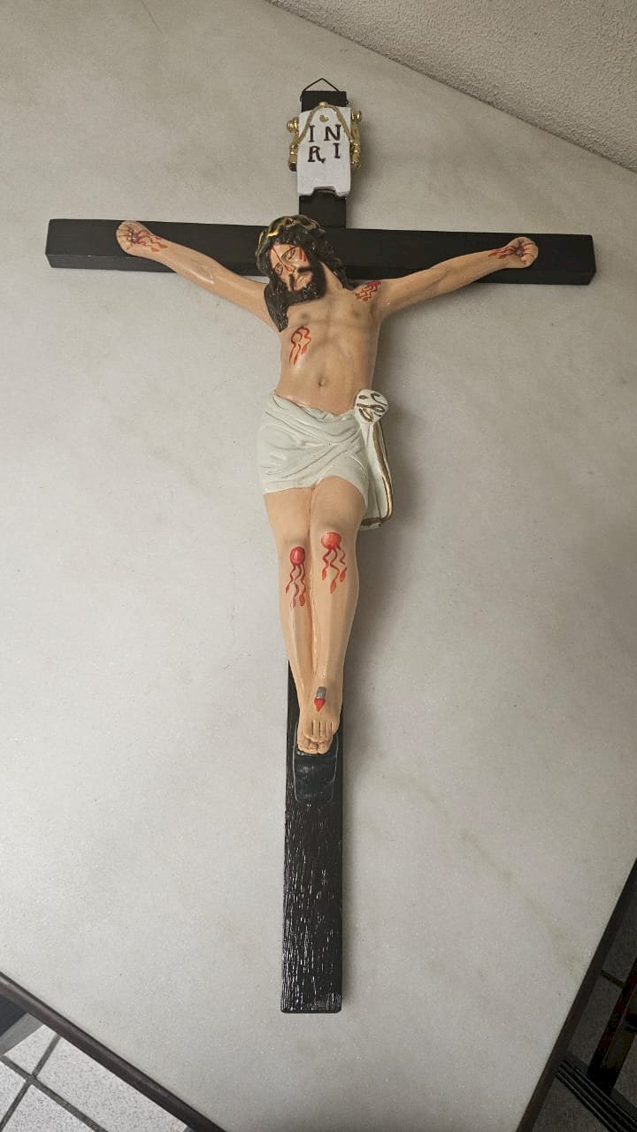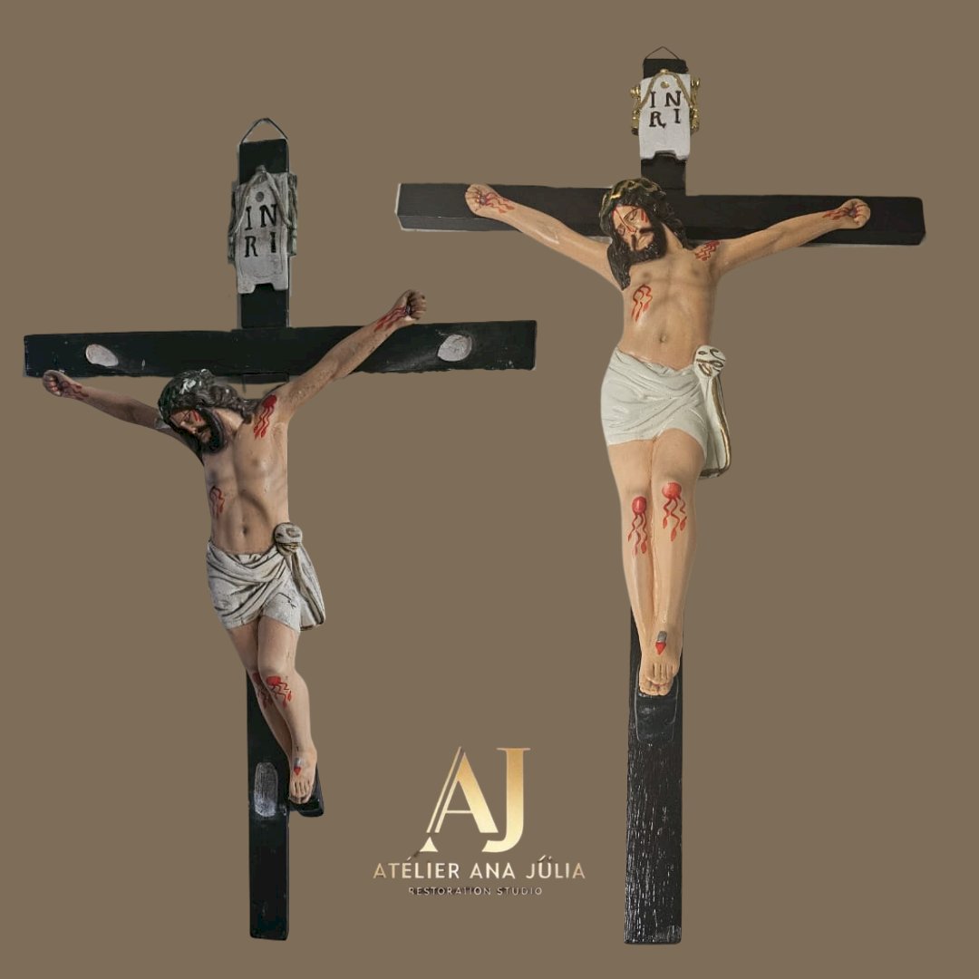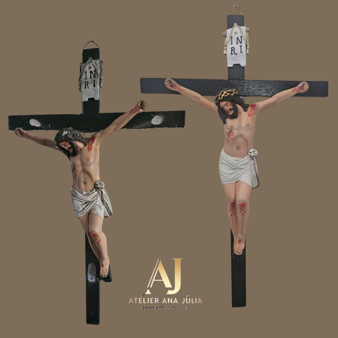 de madeira medindo 92 x 57 cm, com jesus em gesso medindo 52 x 42 – desmontagem e remontagem, limpeza geral, revitalização da madeira, reconstrução de partes do braço direito com remoção de marcas, remoção de lascados, retoques nas peles, cabelo e coroa, repintura da veste com envelhecimento, repintura da placa INRI, redouramento dos elementos da placa INRI, fixação dos dois braços no crucifixo