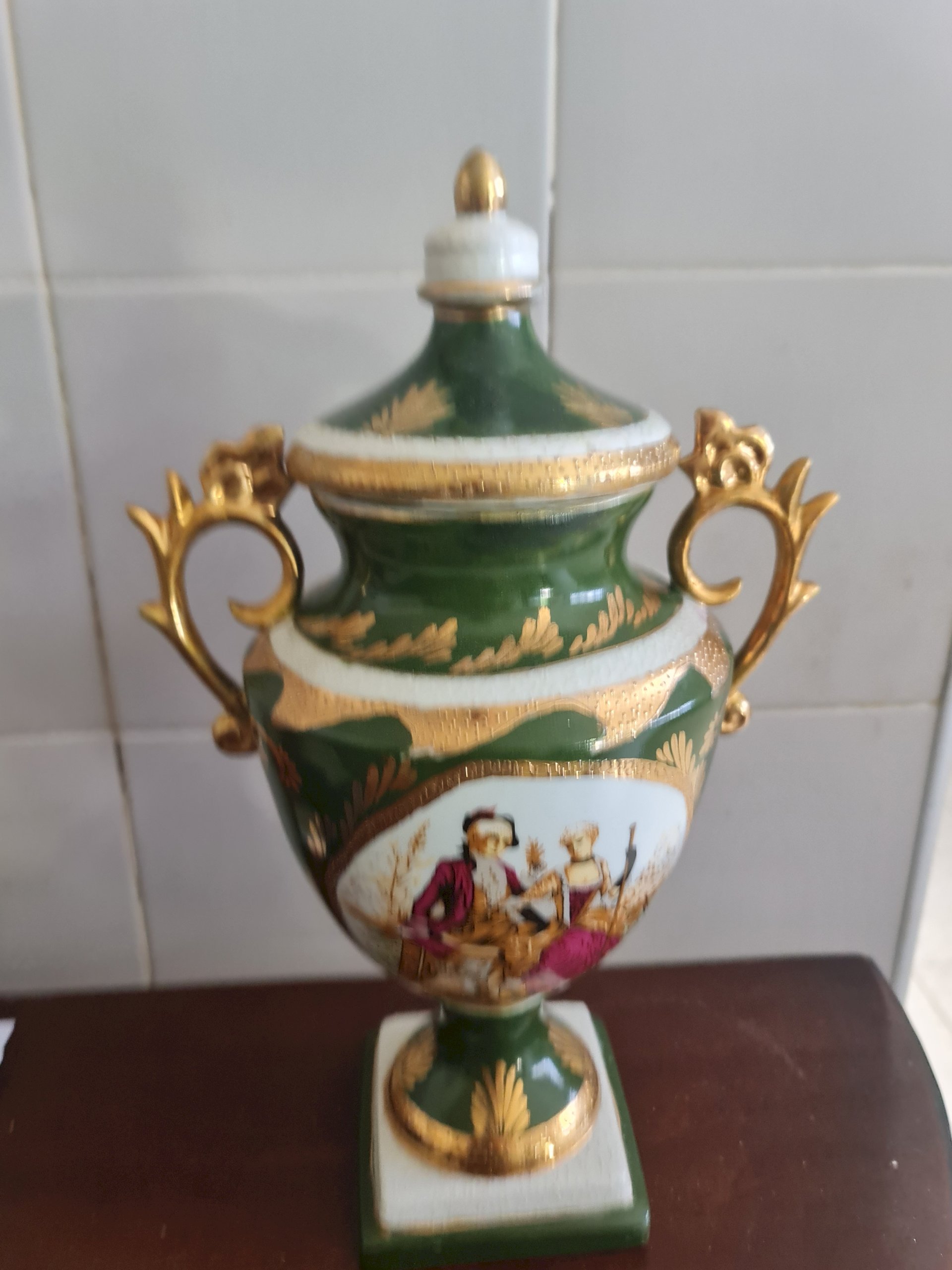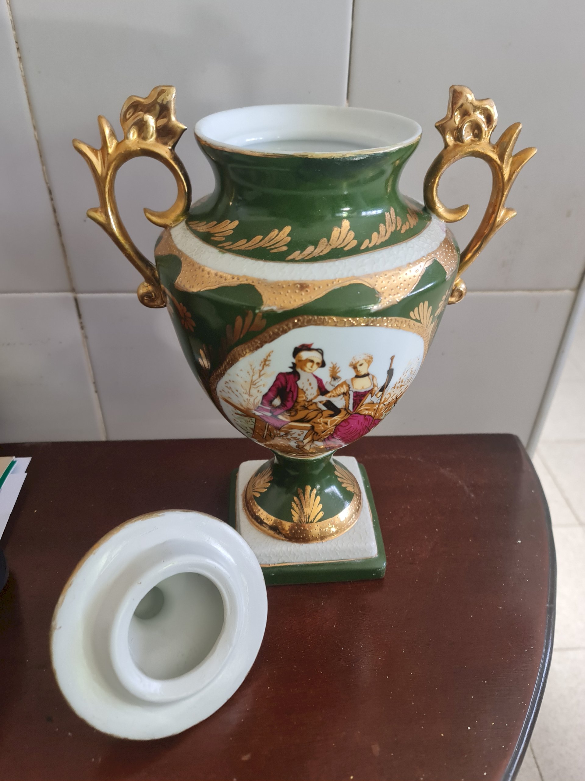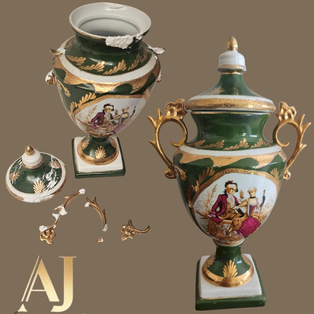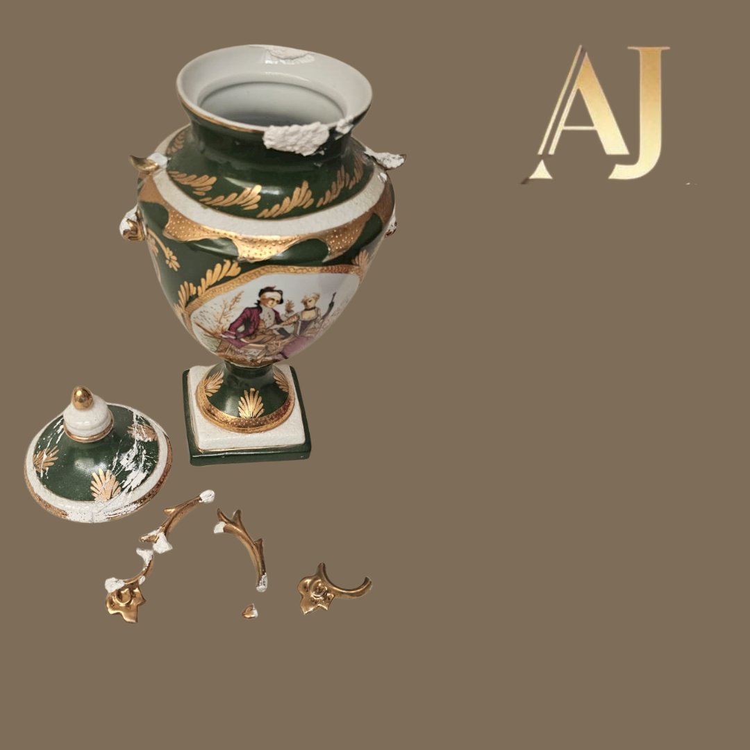 de porcelana, restauração a frio, reconstrução das alças, bordas, tampa, repintira a frio, nos locais restairados, retoque a frio do ouro, vitrificação nos locais restaurados