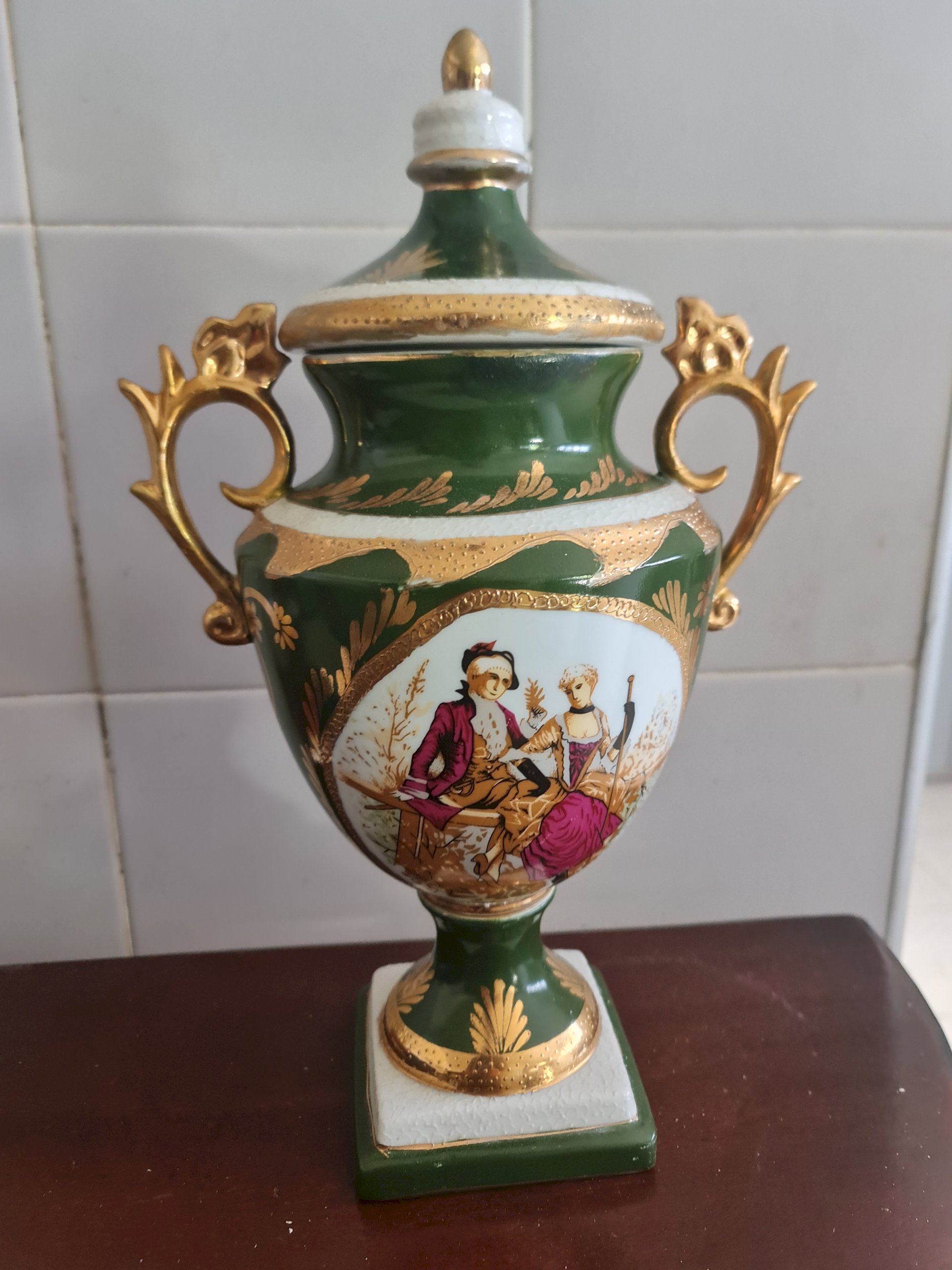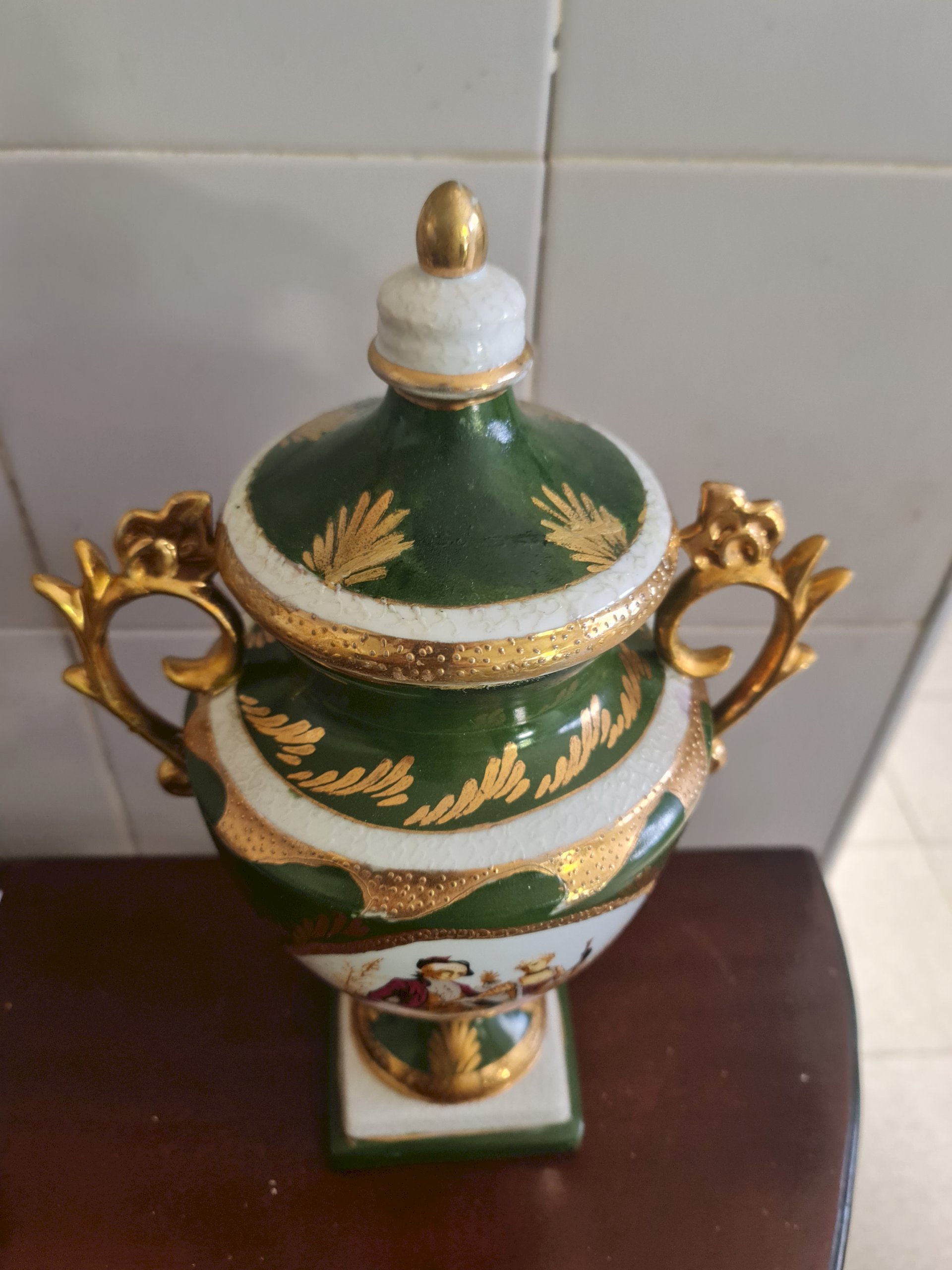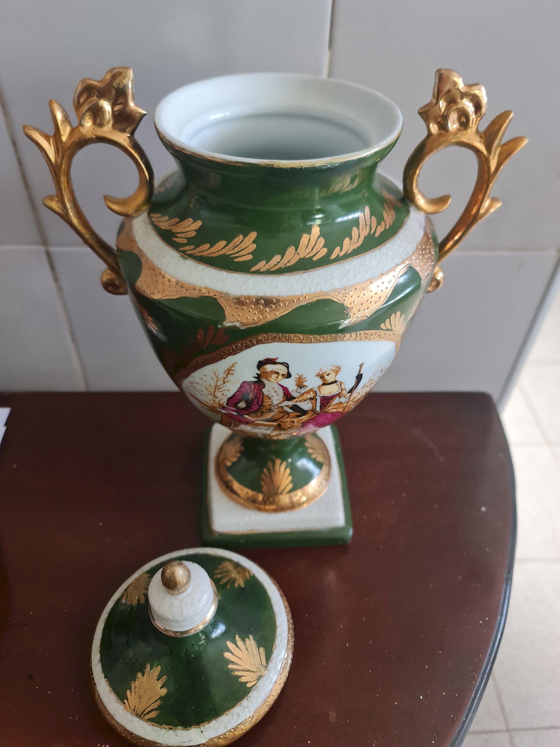 de porcelana, restauração a frio, reconstrução das alças, bordas, tampa, repintira a frio, nos locais restairados, retoque a frio do ouro, vitrificação nos locais restaurados