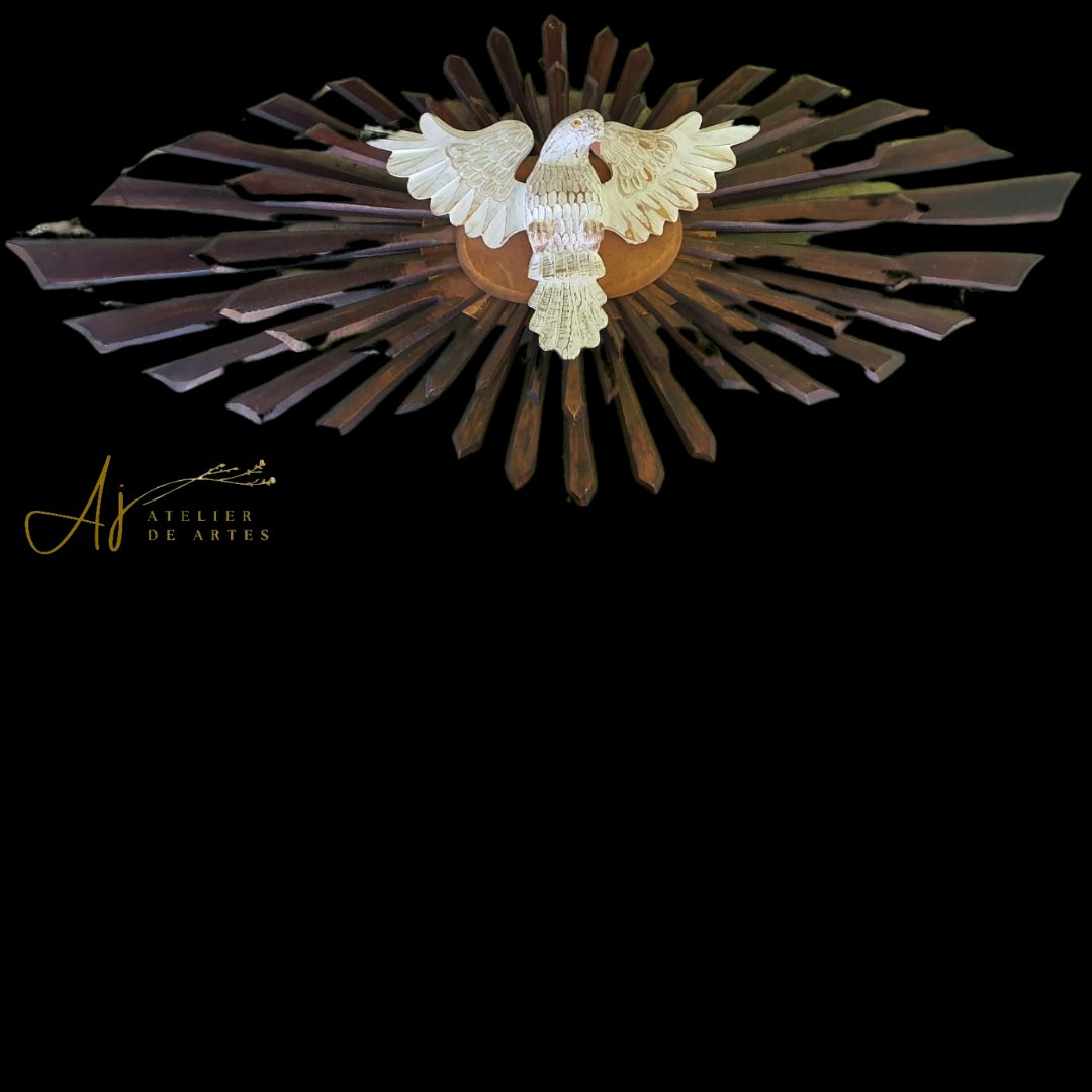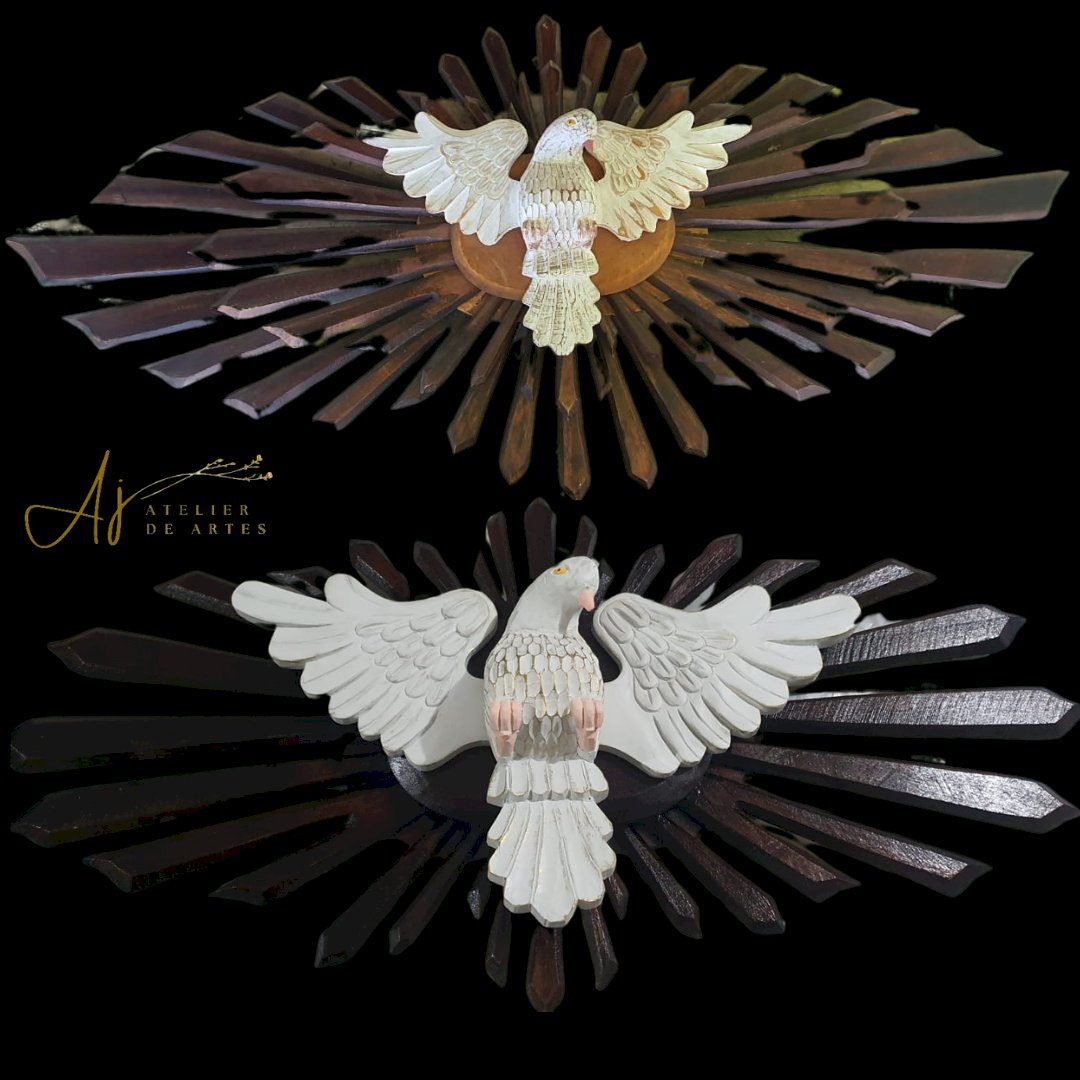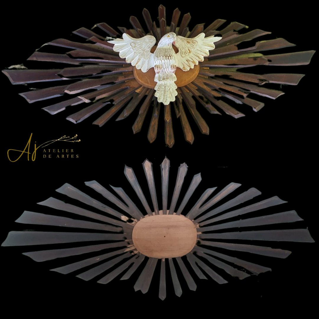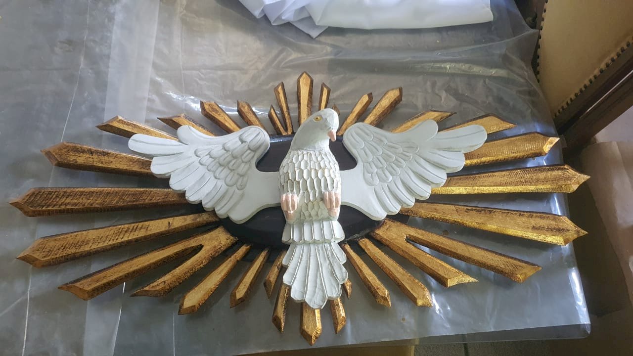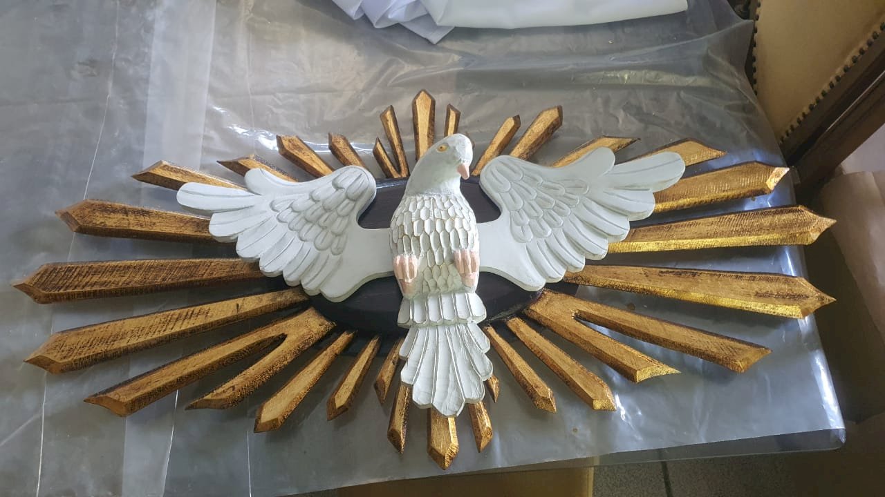 de madeira com mdf, com raios de madeira, medindo 1.63 x 73 cm – desmontagem e remontagem, confecção de um pombo de madeira com asas, substituição de duas placas oval de mdf por placas de madeira, pintura pintura do pombo, remoção dos raios de cima