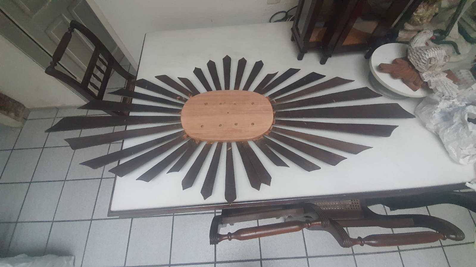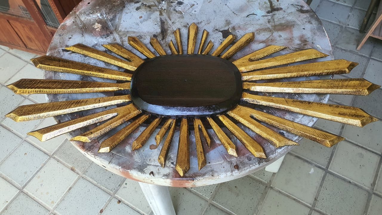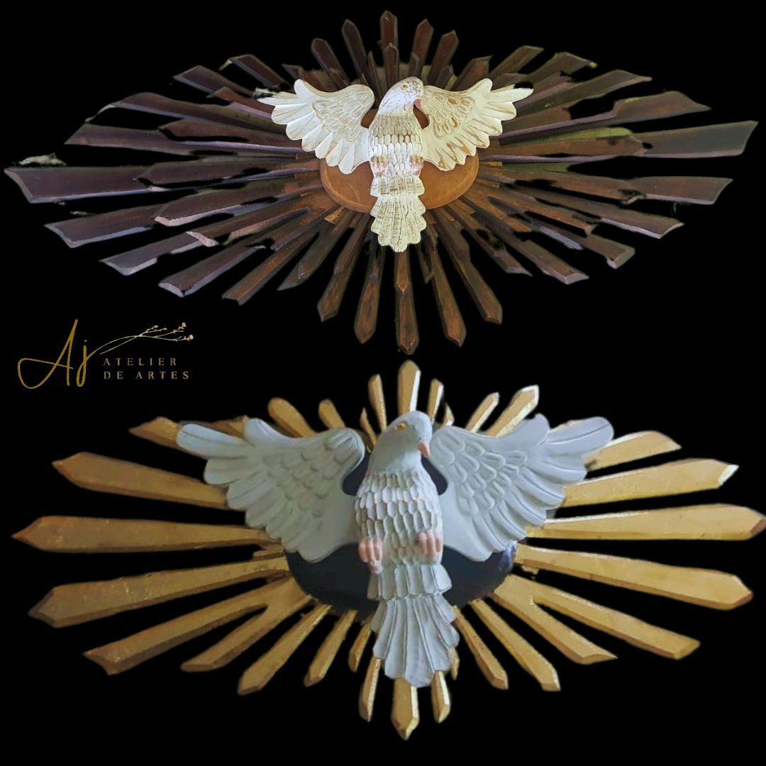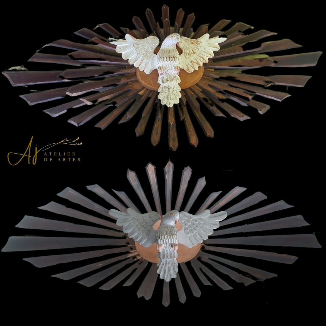 de madeira com mdf, com raios de madeira, medindo 1.63 x 73 cm – desmontagem e remontagem, confecção de um pombo de madeira com asas, substituição de duas placas oval de mdf por placas de madeira, pintura pintura do pombo, remoção dos raios de cima