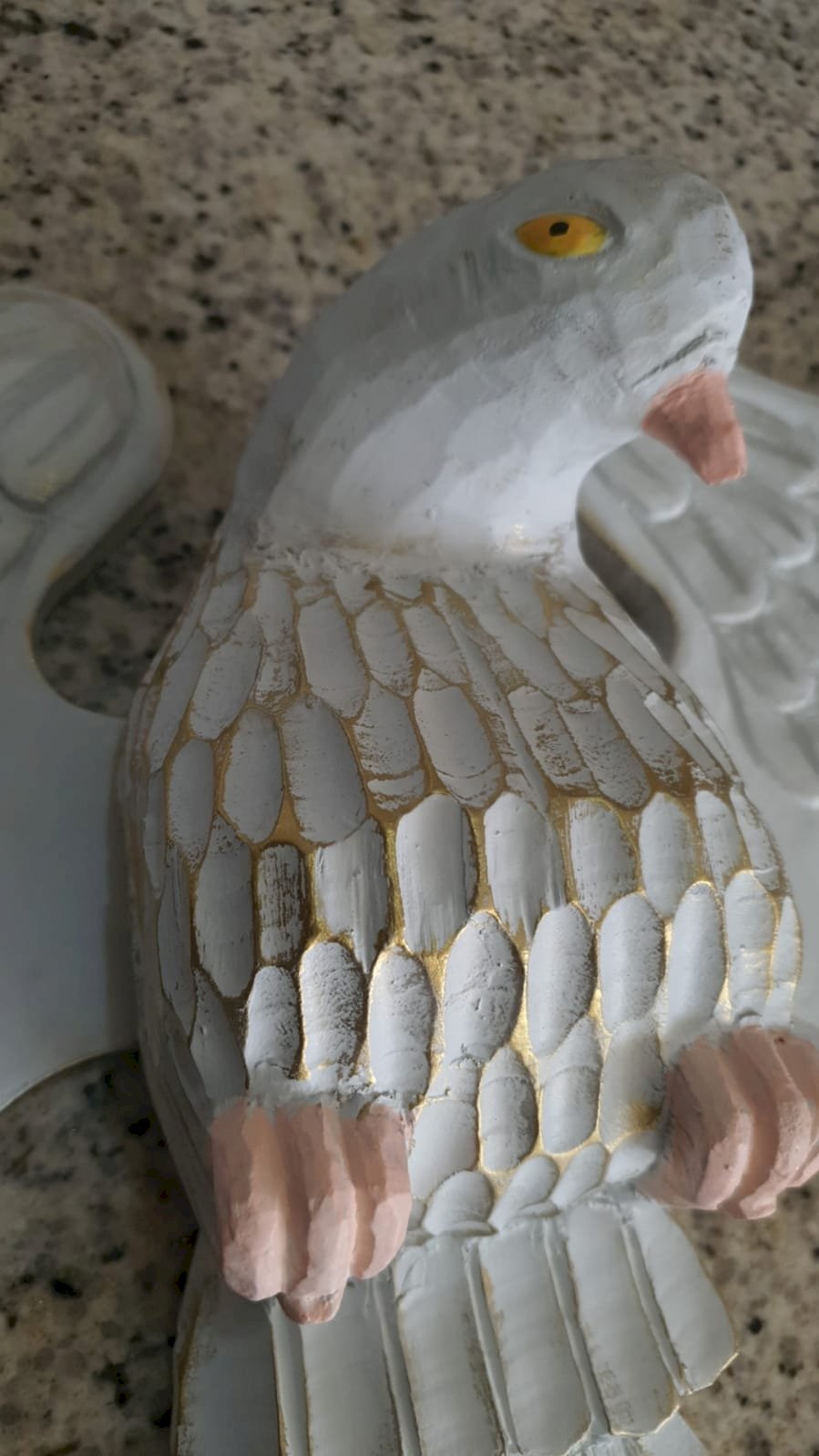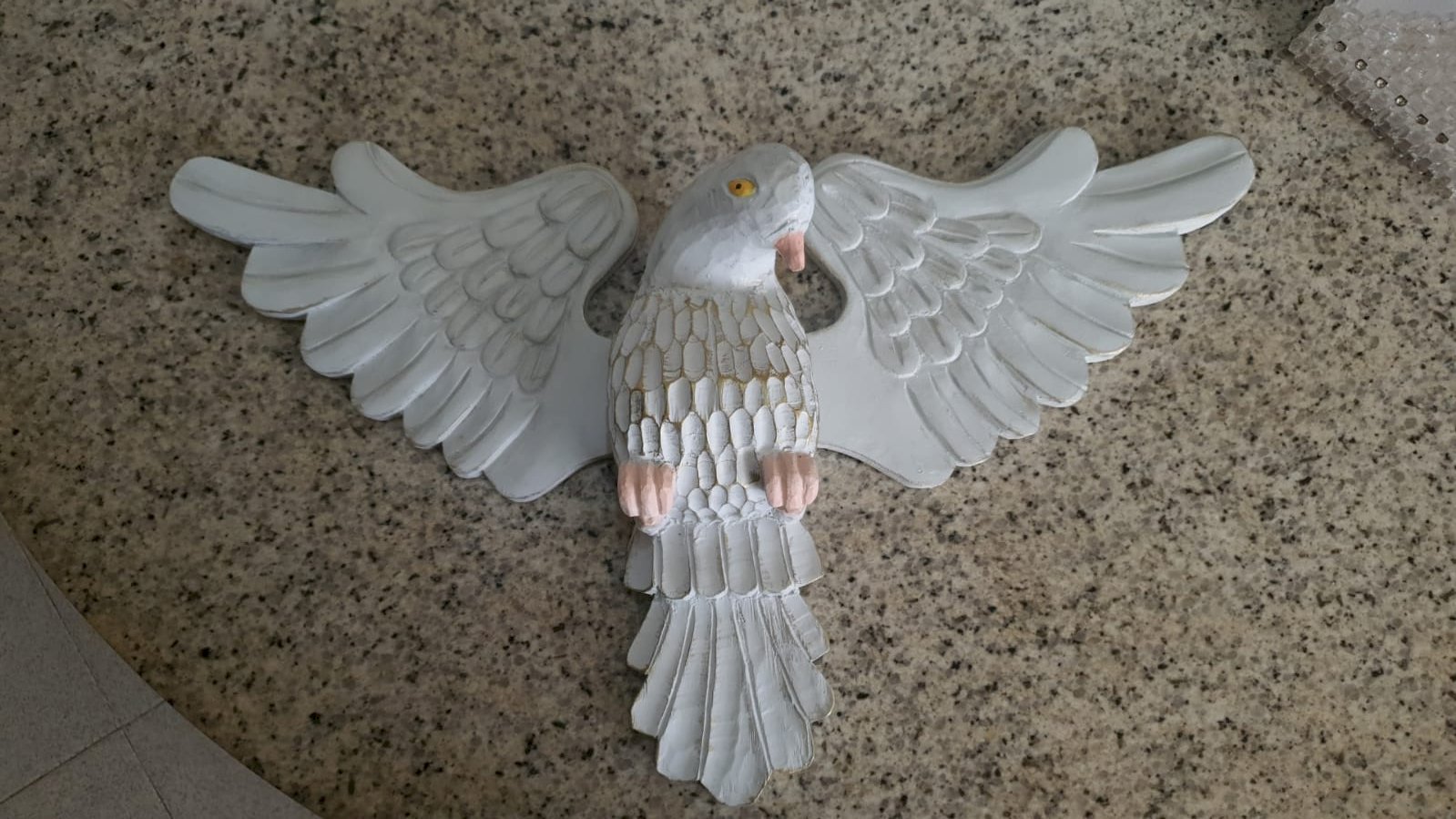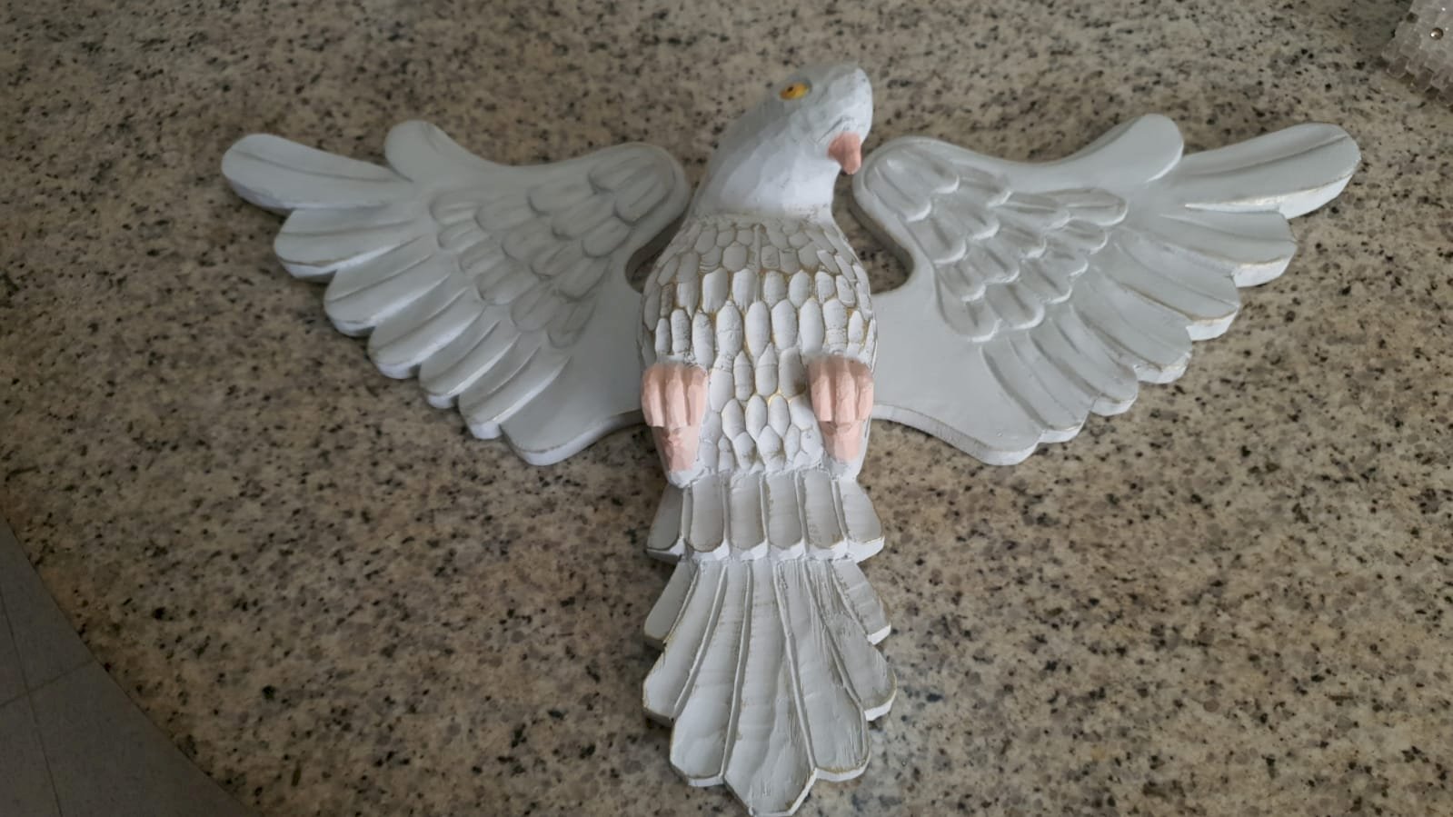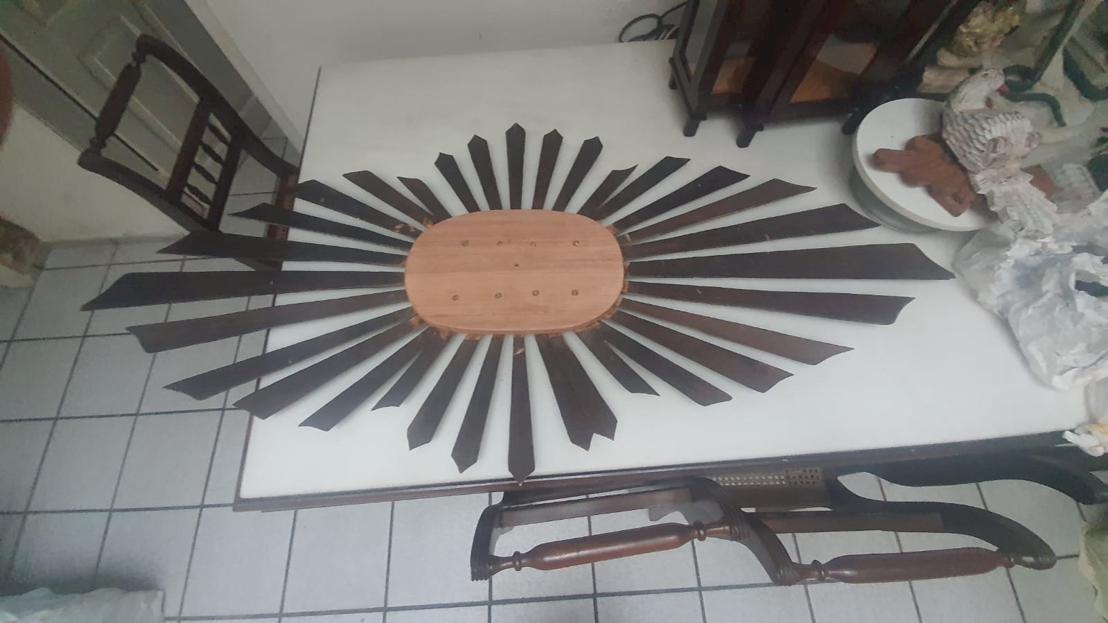 de madeira com mdf, com raios de madeira, medindo 1.63 x 73 cm – desmontagem e remontagem, confecção de um pombo de madeira com asas, substituição de duas placas oval de mdf por placas de madeira, pintura pintura do pombo, remoção dos raios de cima