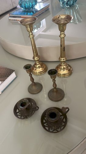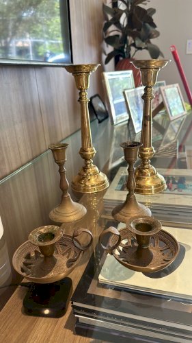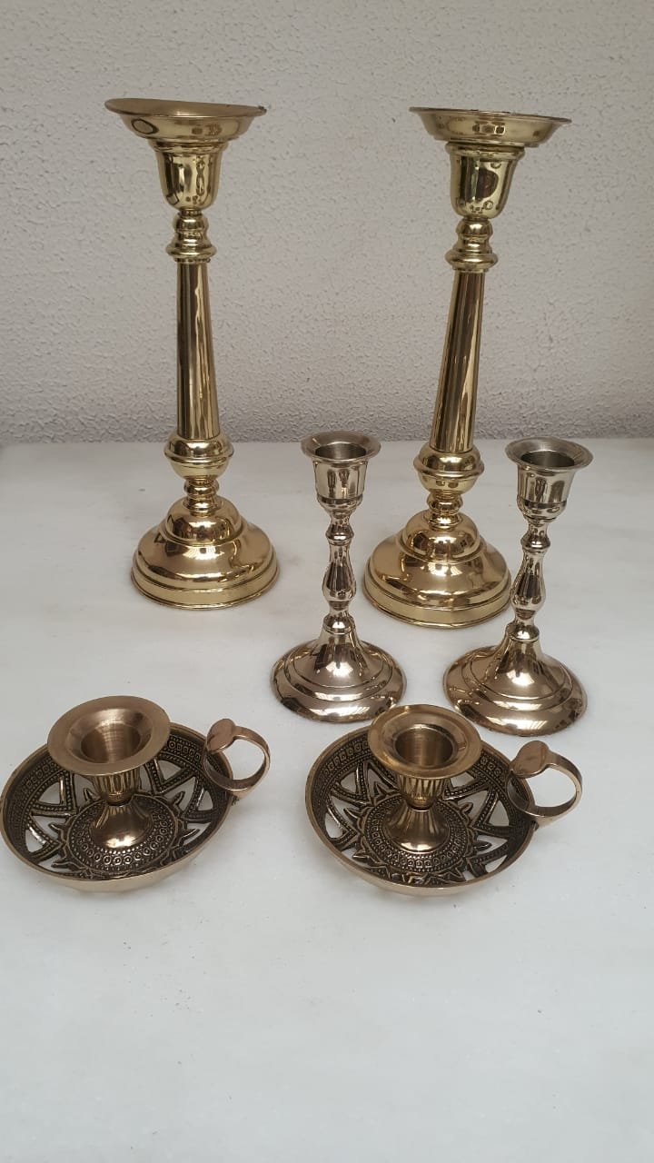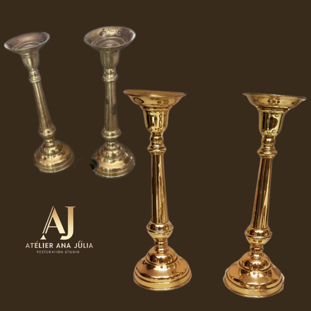 01. Par de Cartiçais em latão, medindo 27 cm de altura e base 9,5 cm de diâmetro - desoxidação, escovação, pimento, lavagem, lustragem, selagem anti intempérie