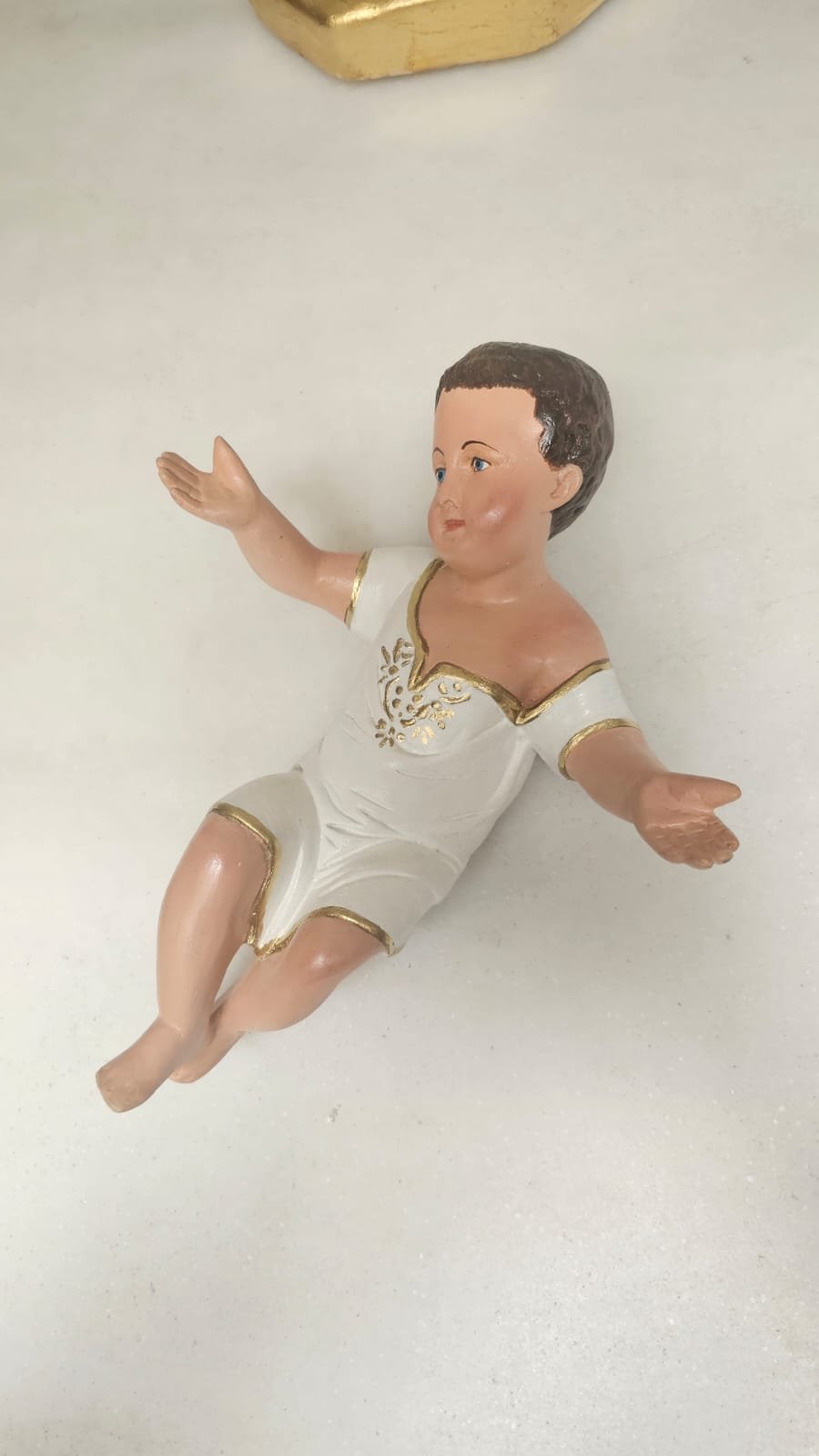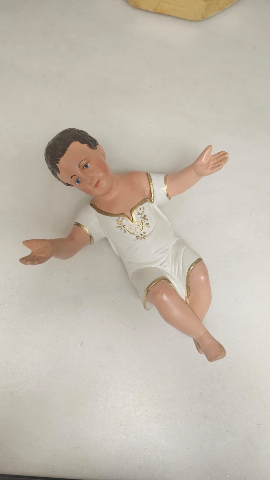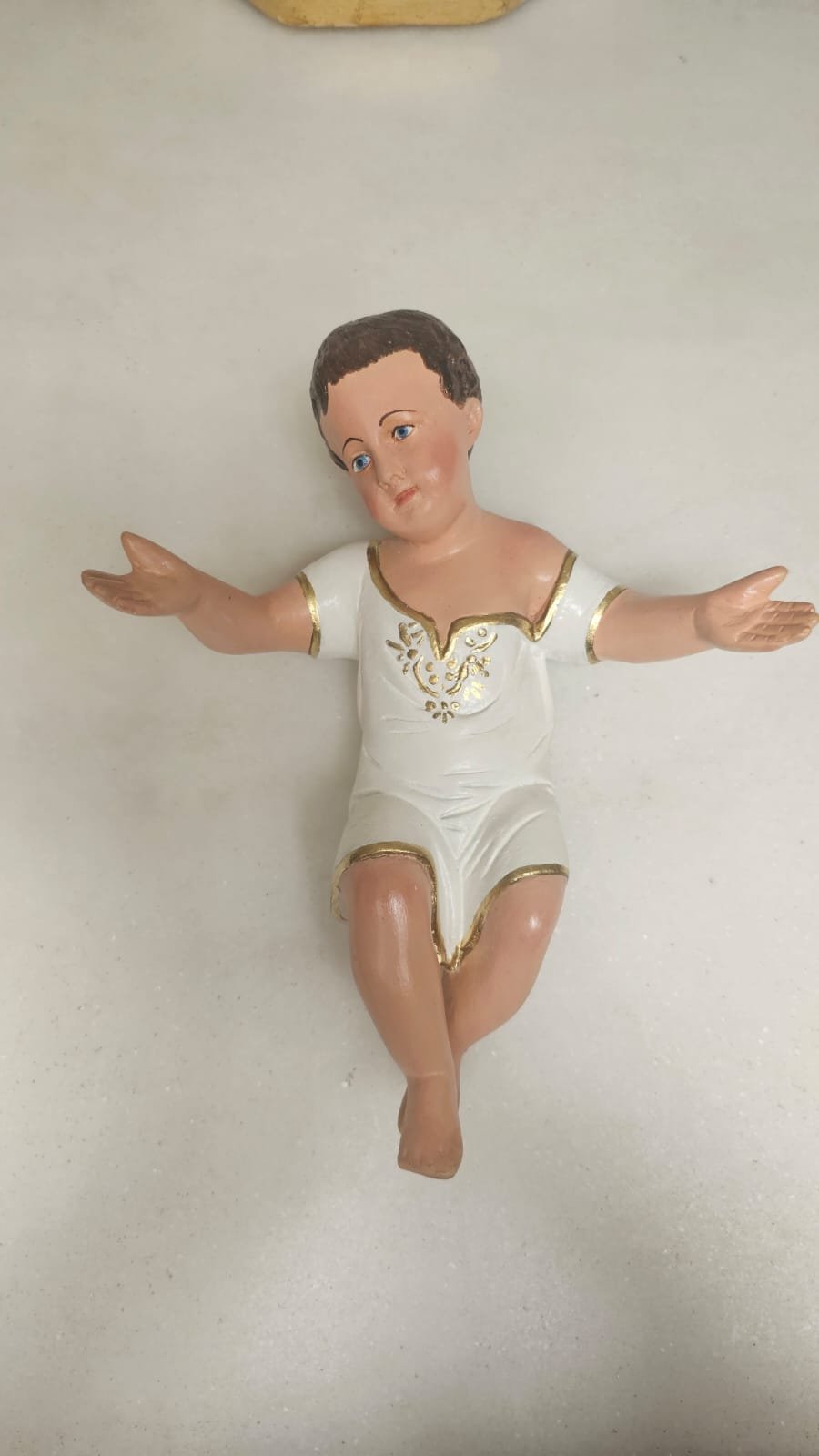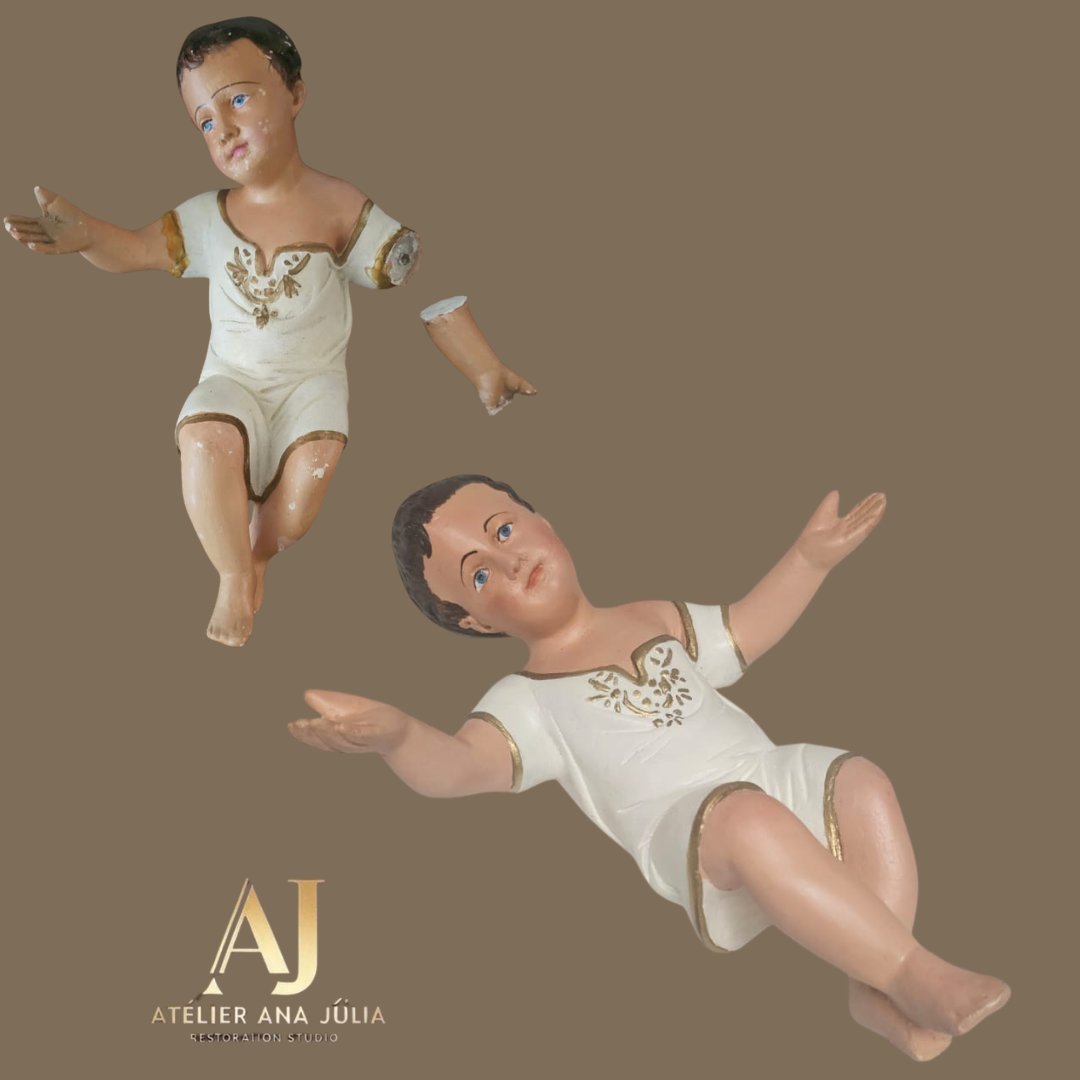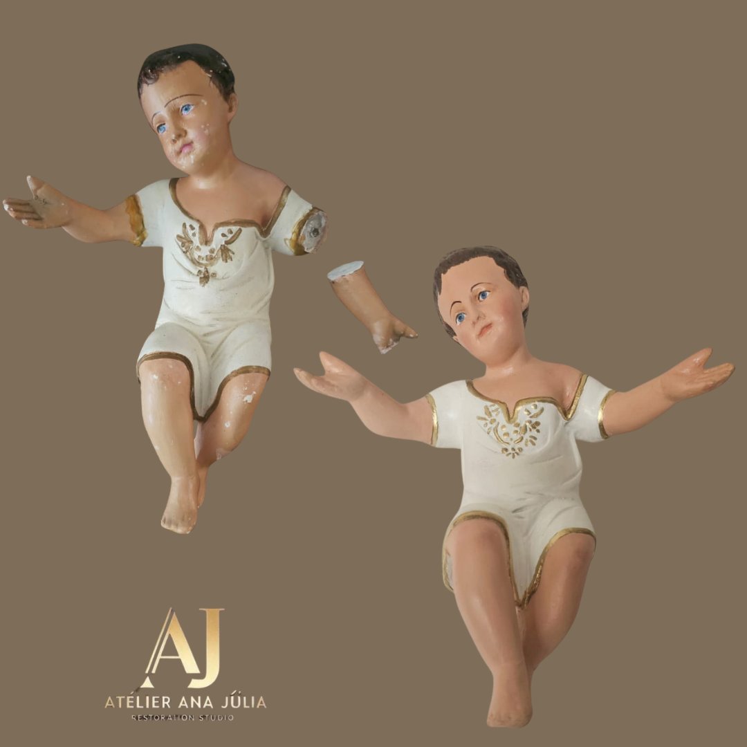 de Gesso, medindo 30 x 23 cm – limpeza geral, remoção do braço direito colado com cola aparente, reconstrução dos dedos da mão esquerda, remoção de rachadura no dedo polegar da mão direita, alisamento do rosto com marcas de restauro, repintura da veste branca com sombreados para dar profundidade nas curvas, repintura da pele, repintura do cabelo, redouramento dos contornos da veste e arabescos, fixação dos dois braços com remoção de marcas, aplicação de feltro na parte de baixo