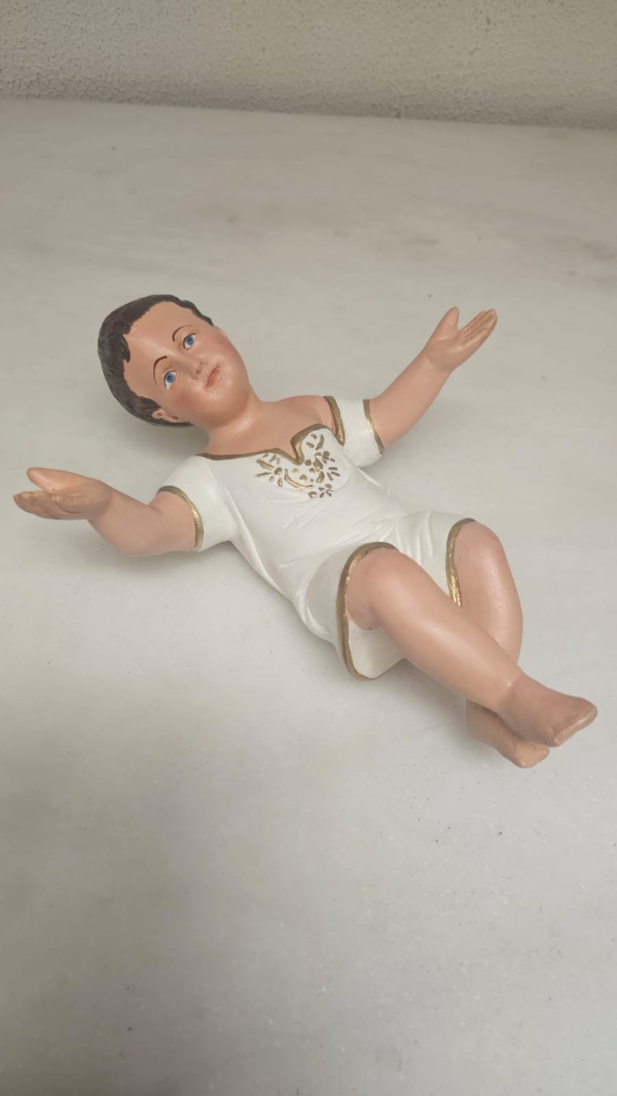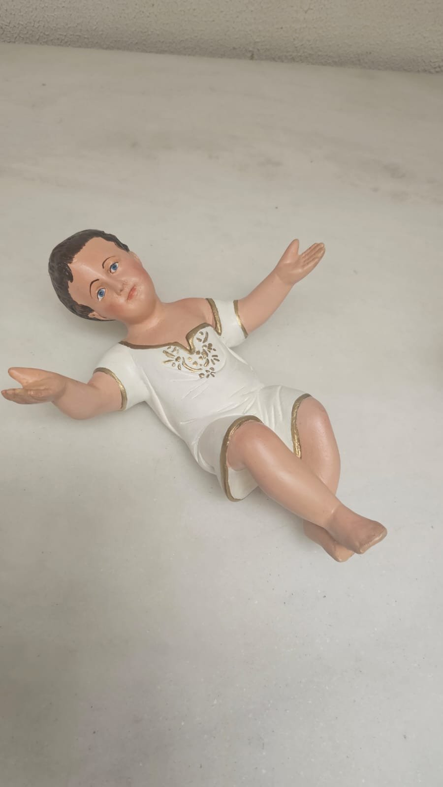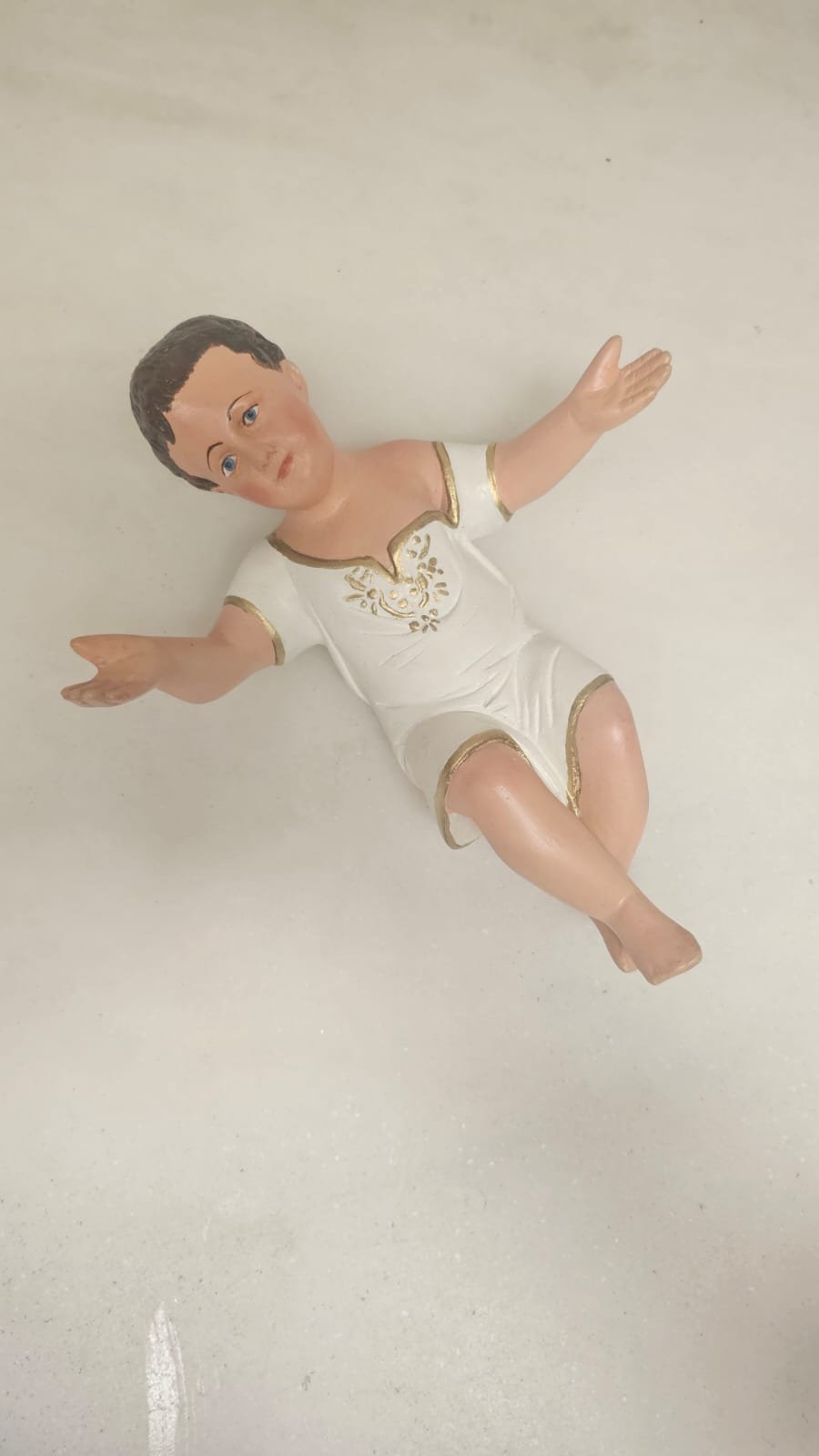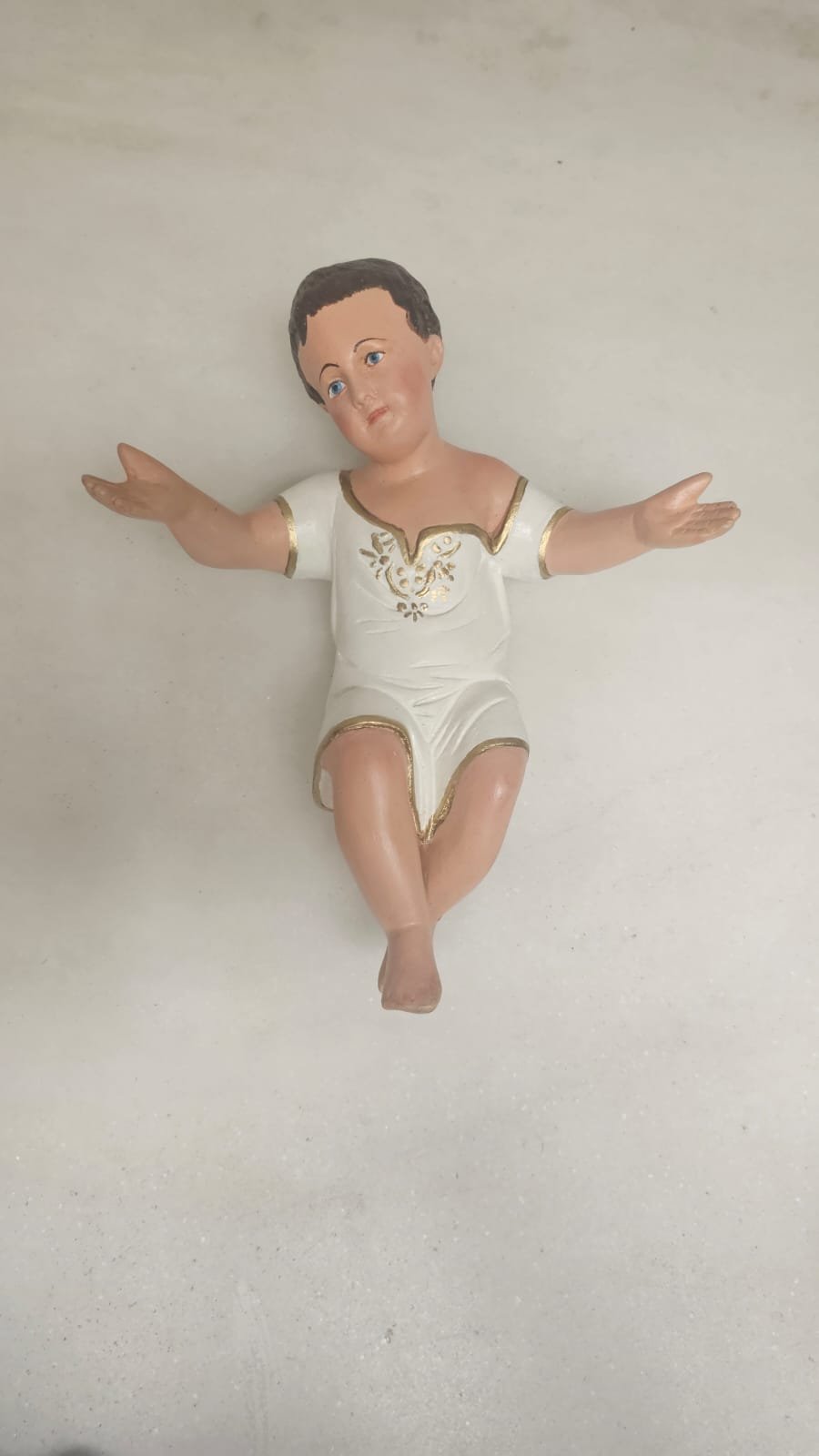 de Gesso, medindo 30 x 23 cm – limpeza geral, remoção do braço direito colado com cola aparente, reconstrução dos dedos da mão esquerda, remoção de rachadura no dedo polegar da mão direita, alisamento do rosto com marcas de restauro, repintura da veste branca com sombreados para dar profundidade nas curvas, repintura da pele, repintura do cabelo, redouramento dos contornos da veste e arabescos, fixação dos dois braços com remoção de marcas, aplicação de feltro na parte de baixo