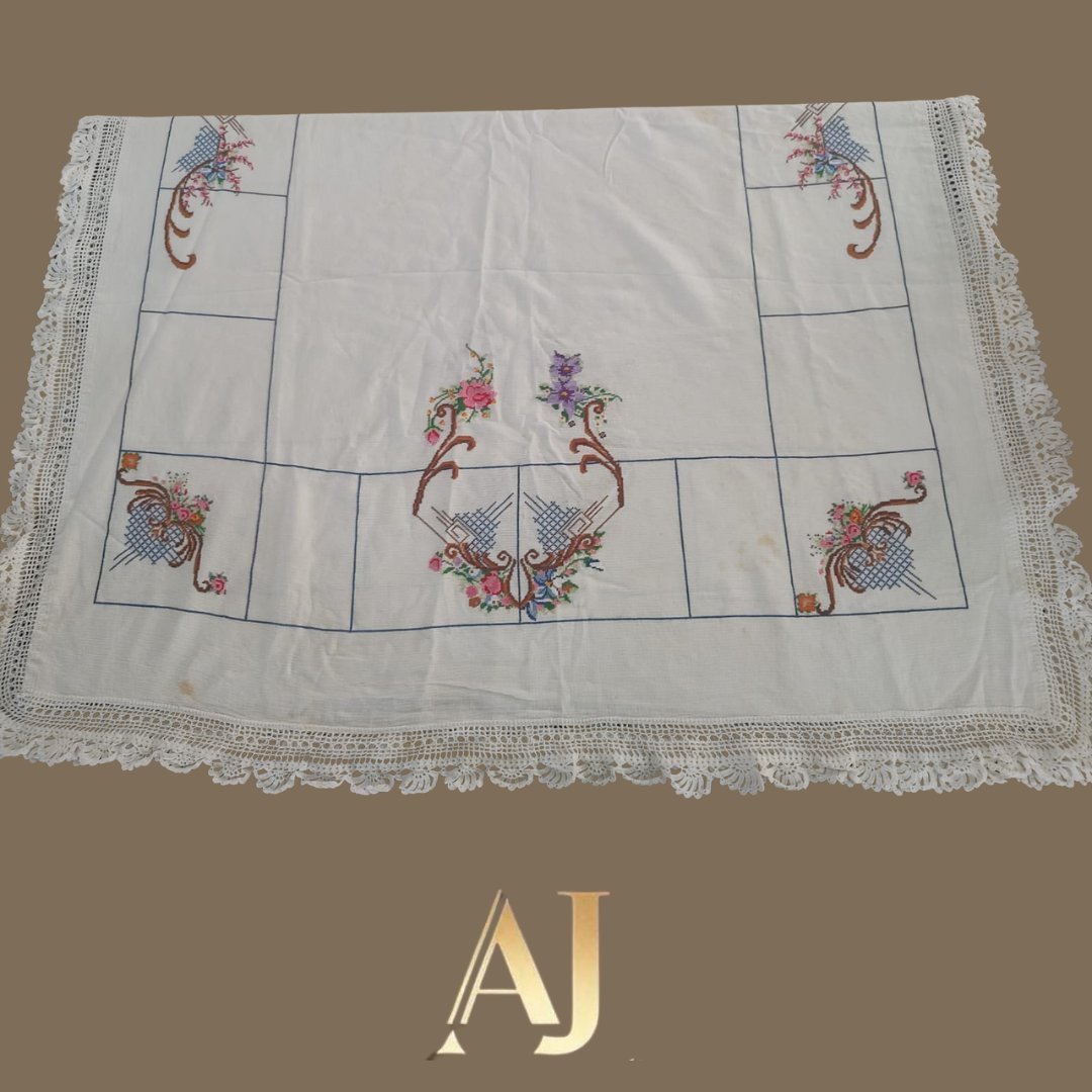 Toalha retangular (1,45x2,46) com ponto cruz e bico crochê -